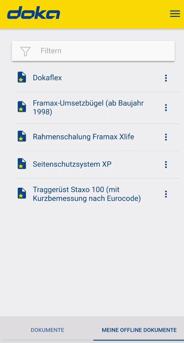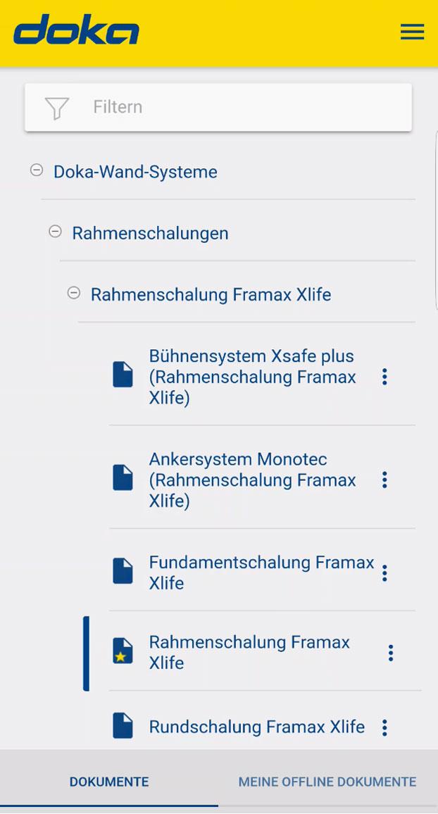 Navigieren Sie durch die Schalungssysteme, um die benötigten Dokumente zu finden (siehe Abb. 1). Sie können Dokumente öffnen oder auch herunterladen (⁞). Somit können diese auch dann abgerufen werden, wenn keine Internetverbindung vorhanden ist.