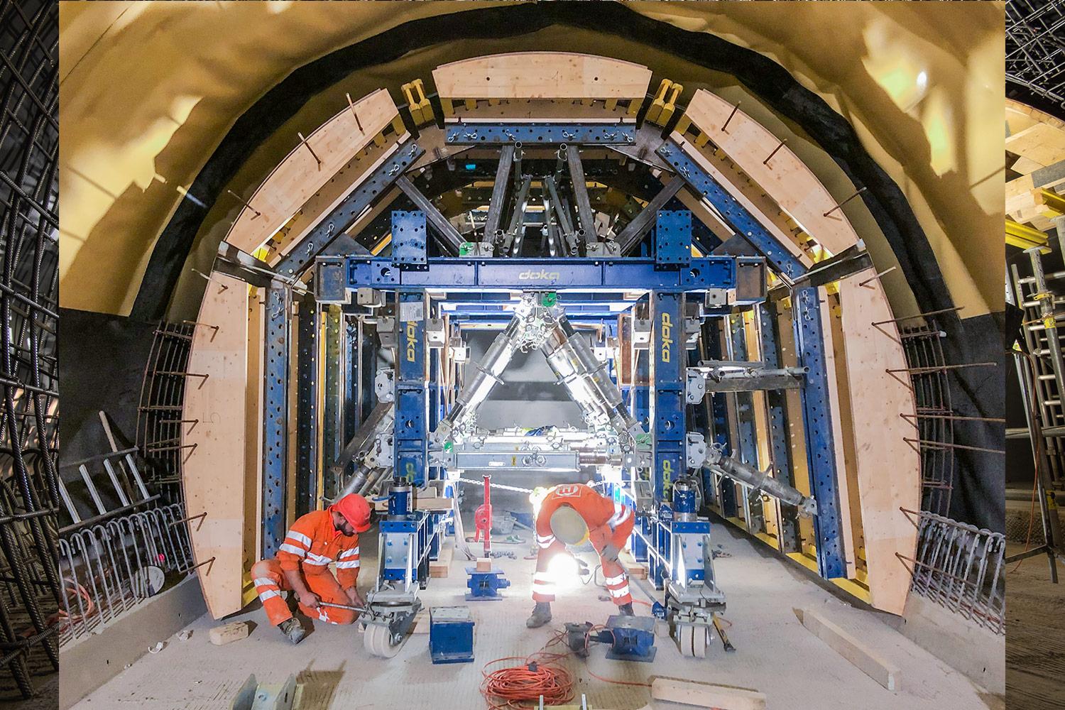 Die Bauarbeiten finden während eines geplanten, zweijährigen Wartungsintervalls des Beschleunigers statt, da Erschütterungen während des Betriebs des LHC die Experimente beeinträchtigen könnten. Entsprechend groß ist der Zeitdruck für das Baustellenteam, da der Teilchenbeschleuniger per Anfang 2021 wieder in Betrieb gehen soll. Die Marti Tunnel AG – spezialisiert auf den konventionellen und mechanisierten Vortrieb – baute für den 300 m langen Hauptstollen einen eigenen Stahlschalwagen. Für das Schalen der Querschläge, Anschlussbauten und Treppenschächte zählen die Tunnelspezialisten von Marti Tunnel auf das Knowhow von Doka. Die hohe Komplexität der verschiedenen Bauten, die Wiederverwendbarkeit und Abstimmung der Schalungselemente aufeinander und der komplexe Bauablauf erforderte das Zusammenspiel und die umfassende Erfahrung und das Wissen der Doka- Tunnelexperten, sodass dem Kunden für jedes Bauwerk zeitnah eine überzeugende Lösung offeriert werden konnte.