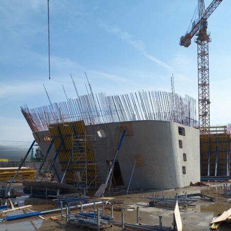 Die 10 konischen, mit SVB betonierten Raumstützen des Bauwerks stellten höchste Anforderungen an Frischbetondruck, Geometrie und Qualität der Betonflächen. Konsequente 3D-Planung der brettbelegten, vormontierten Top 50-Elemente mit Kollisionprüfung der Schalungsanker gewährleisteten Passgenauigkeit und einfachen Zusammenbau auf der Baustelle.