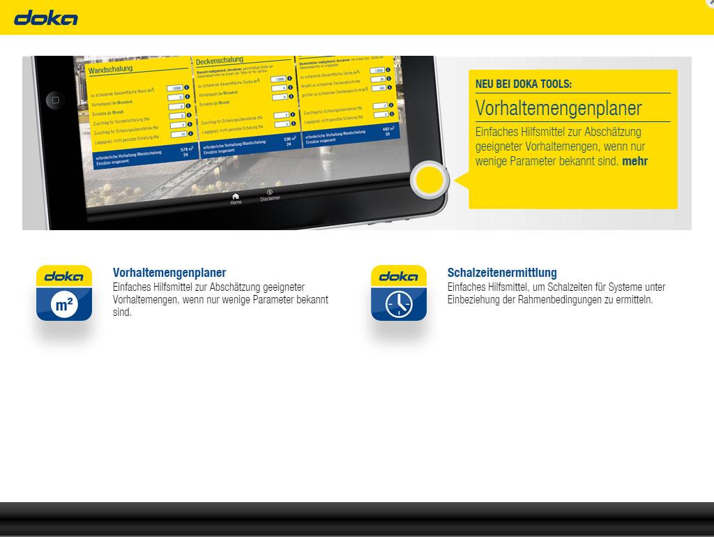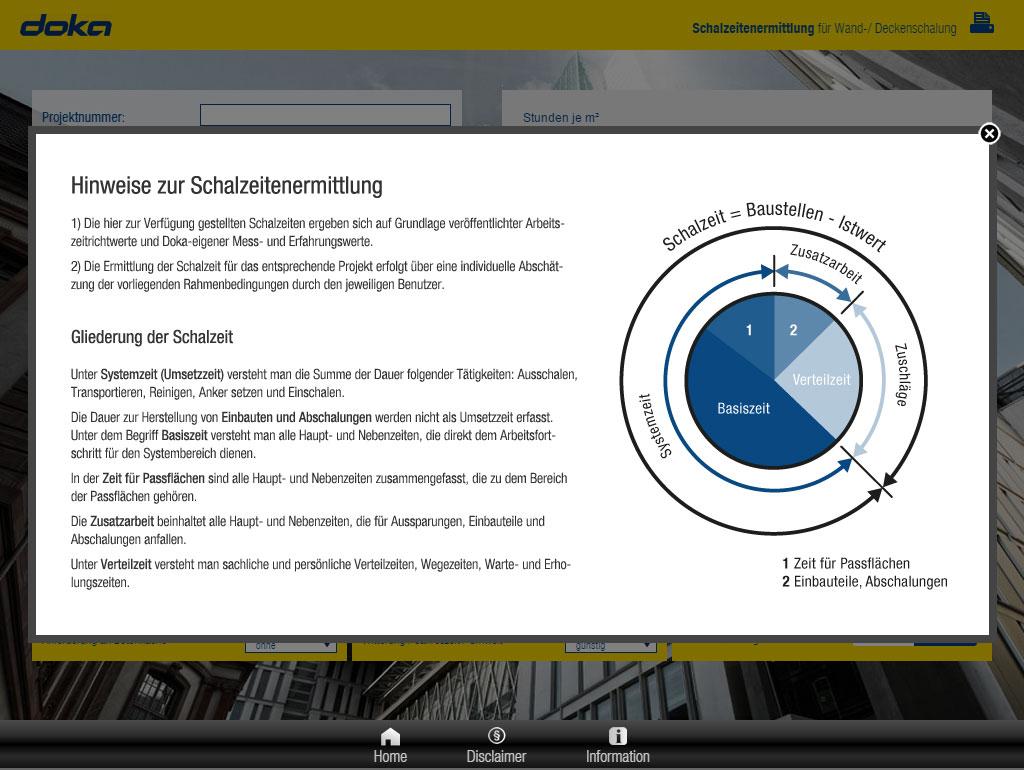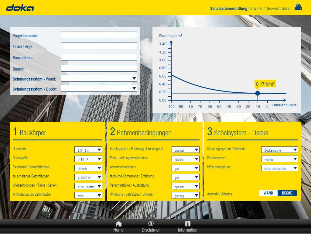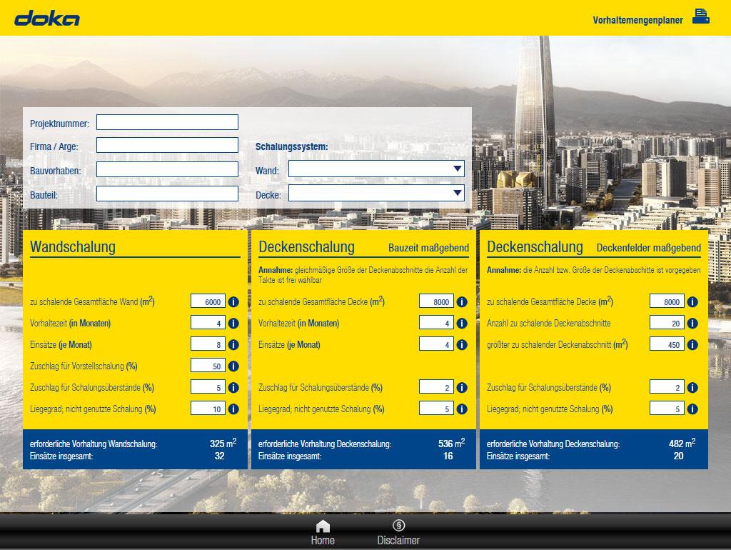 Einfaches Hilfsmittel zur Abschätzung geeigneter Vorhaltemengen wenn nur wenige Parameter bekannt sind – zB: herzustellende Betonflächen, Bauzeit. Der Anwender kann für seine eigene Angebotserstellung bzw. Kostenplanung gegenüber dem Bauherrn anhand der selbst eingegebenen Daten eine ca. Vorhaltemenge abschätzen. Doka-Erfahrungen hinsichtlich einer sinnvollen Menge von Vorstellschalung, Schalungsüberständen und Liegegrad fließen über empfohlene Wertebereiche für Zuschlagsfaktoren in die Berechnung ein.