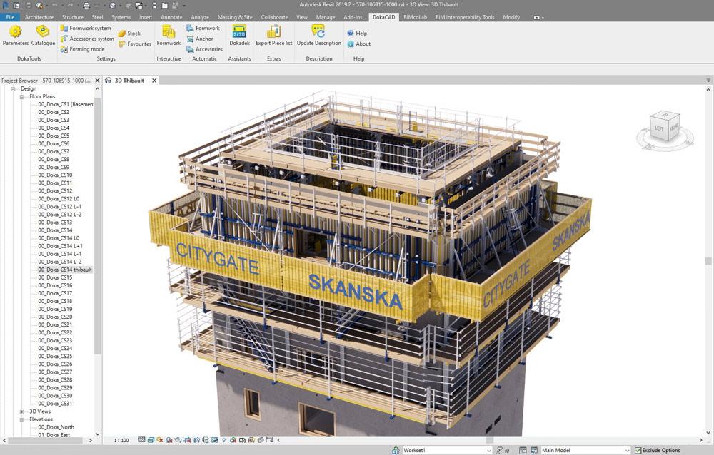 Bevor es aber soweit war, erstellten die BIM-Experten von Doka mithilfe der Planungssoftware DokaCAD for Revit, vorab 3D-Schalungslösungen. DokaCAD for Revit steht für den Gesamtprozess der Schalungsplanung in BIM und ist ein Plug-in für Autodesk Revit, welches native, automatisierte Schalungsplanung in einer BIM Software erlaubt. Einer der größten Vorteile bestand darin, dass der Kunde die von Doka gelieferte Schalungsplanung ohne Datenverluste in das eigene Revit-Modell übernehmen konnte.