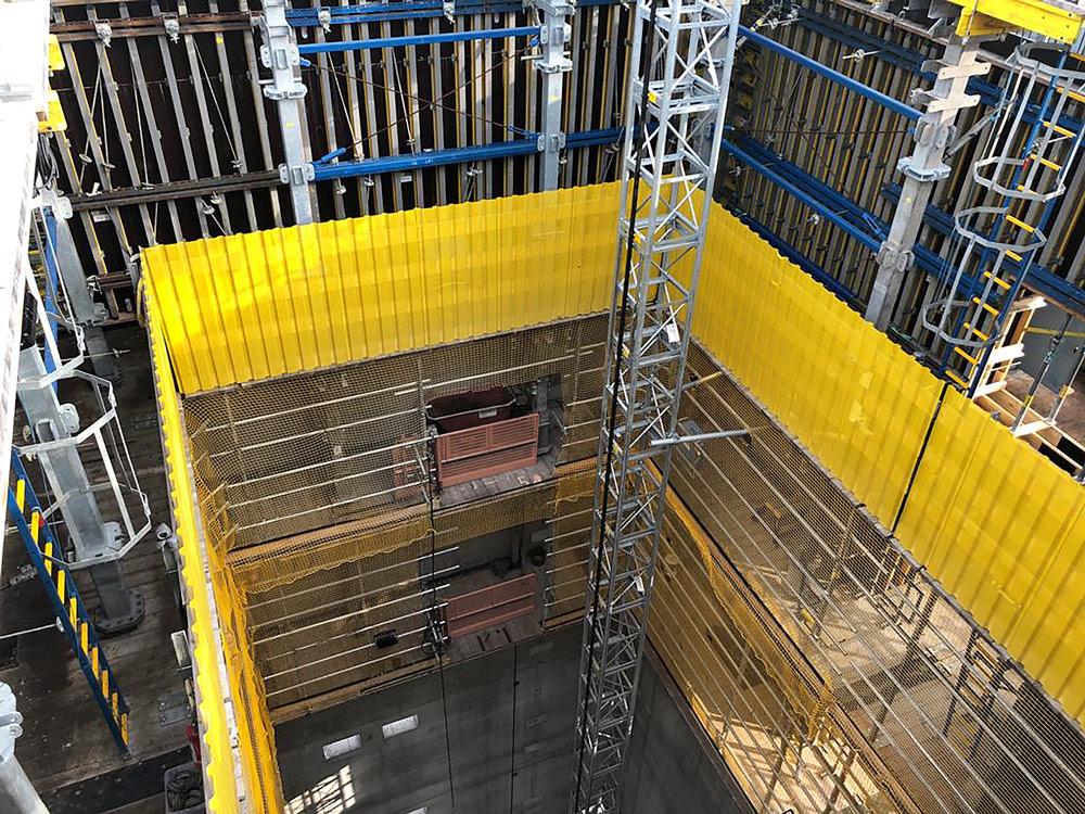 Hinsichtlich Sicherheit wurden unter anderem speziell angefertigte Treppen als Gehwege zwischen den verschiedenen Ebenen installiert. Außerdem wird gewährleistet, dass in der gesamten Bauphase ein sicherer Zugang vom Bauaufzug zum Doka-Klettersystem besteht.