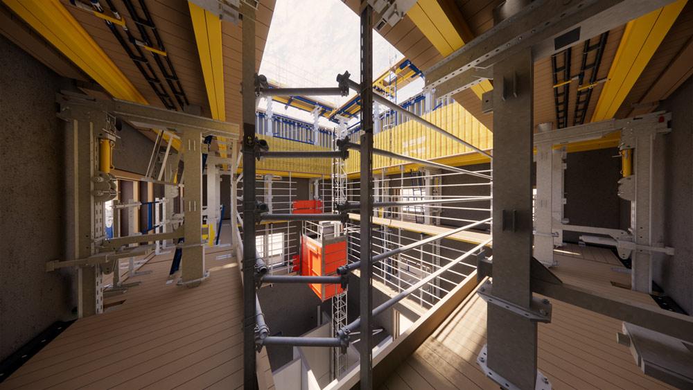 Bereits vor dem offiziellen Baubeginn konnten Techniker von Doka, Skanska und Alimak (Zulieferer des Bauaufzuges) virtuell durch den 3D-Gebäudekern gehen, detailliert die Doka- Selbstkletterschalung SKE50 plus begutachten und das Zusammenspiel mit dem Bauaufzug - Zugänglichkeit in jeder Bauphase - abklären.