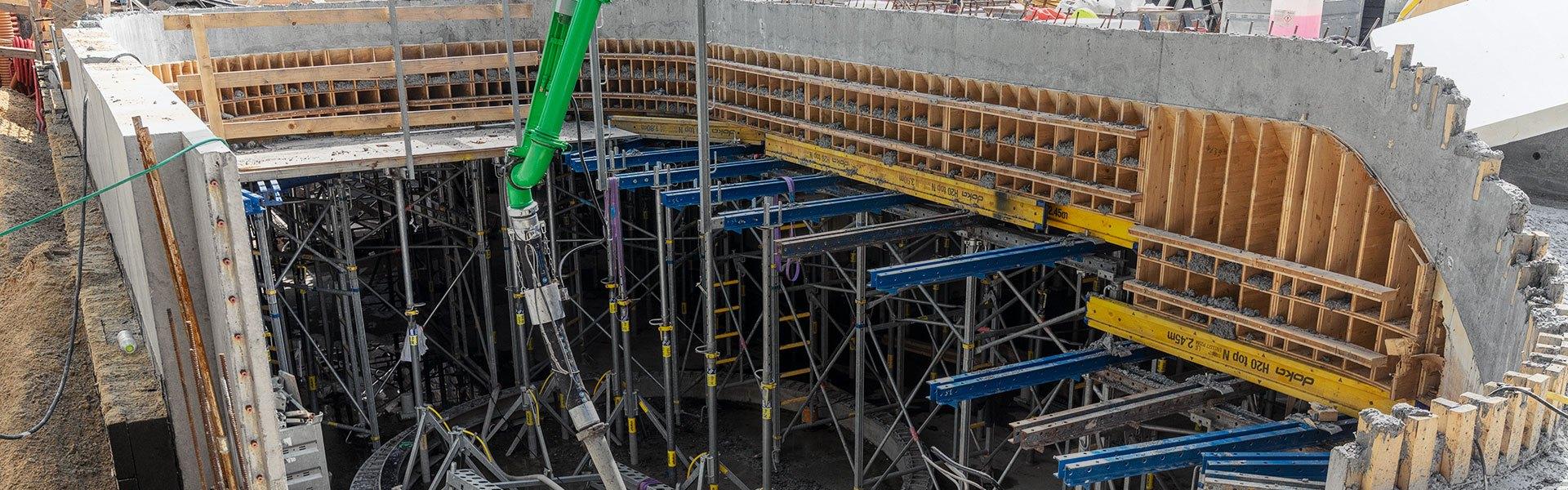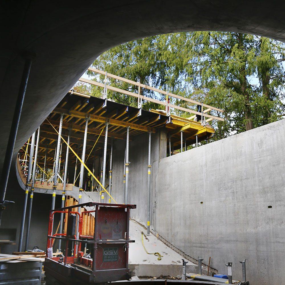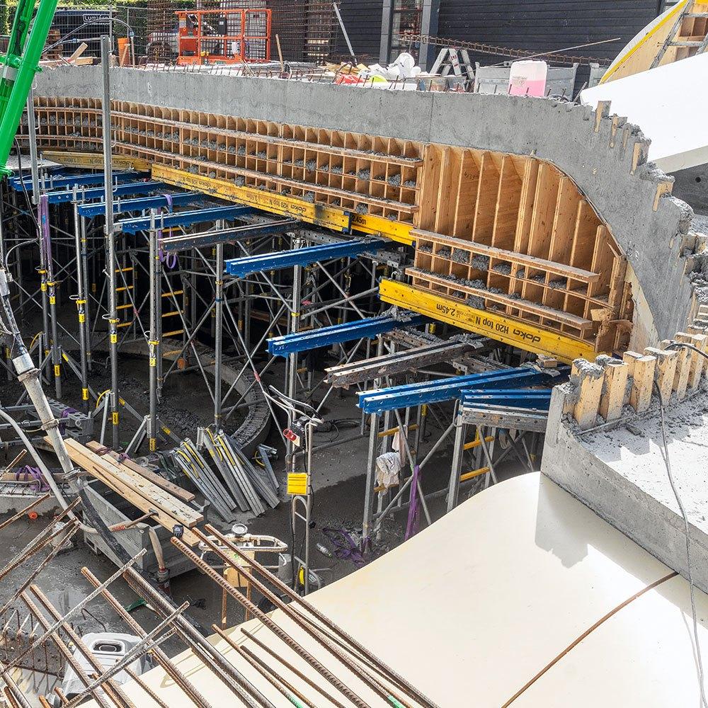 Qua kravene til overfladerne valgte man den præmierede Xface finér, som giver en silkeblød overflade. De yderligere krav om, at bygherren heller ikke ønskede ankerhuller i væggen blev løst med en kombination af støttebukke og SL1 stålprofiler, som kunne optage støbetrykket uden udbøjninger og tilfredsstillende støbeskels-løsninger. De runde hjørner sammen med runde overgange fra væg til loft blev løst med specielt tilpassede CNC skårede spanter. DokaFlex og Staxo 100 er anvendt til de forskellige dækløsninger, og igen med Xface finér for at opnå det samme ensartede udseende af betonen.