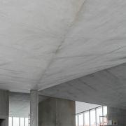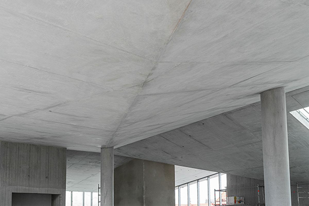 The building is made of monolithic concrete structures with heating installations embedded in the structure. Out of the total of 75,000 m² of formwork surface, 42,000 m² are with fair-faced concrete requirements.