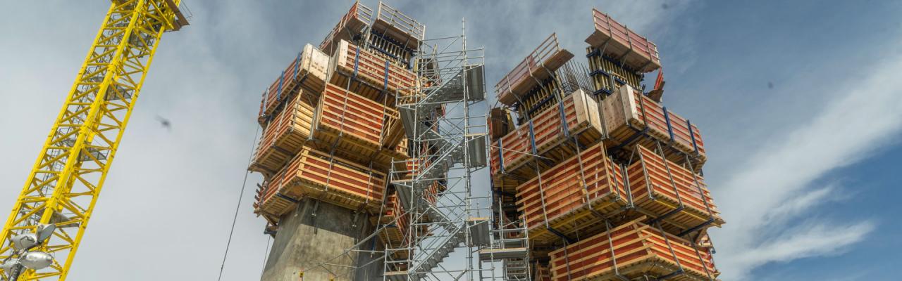 The transition area, where the pylon legs join, was a particular challenge, as there was not enough room for a standard self-climbing solution. Instead, Doka developed a custom working platform which was based for the 13m high transition area. The platform consists of horizontal supporting construction frames which transferred the concrete loads safely in the previous pouring section.