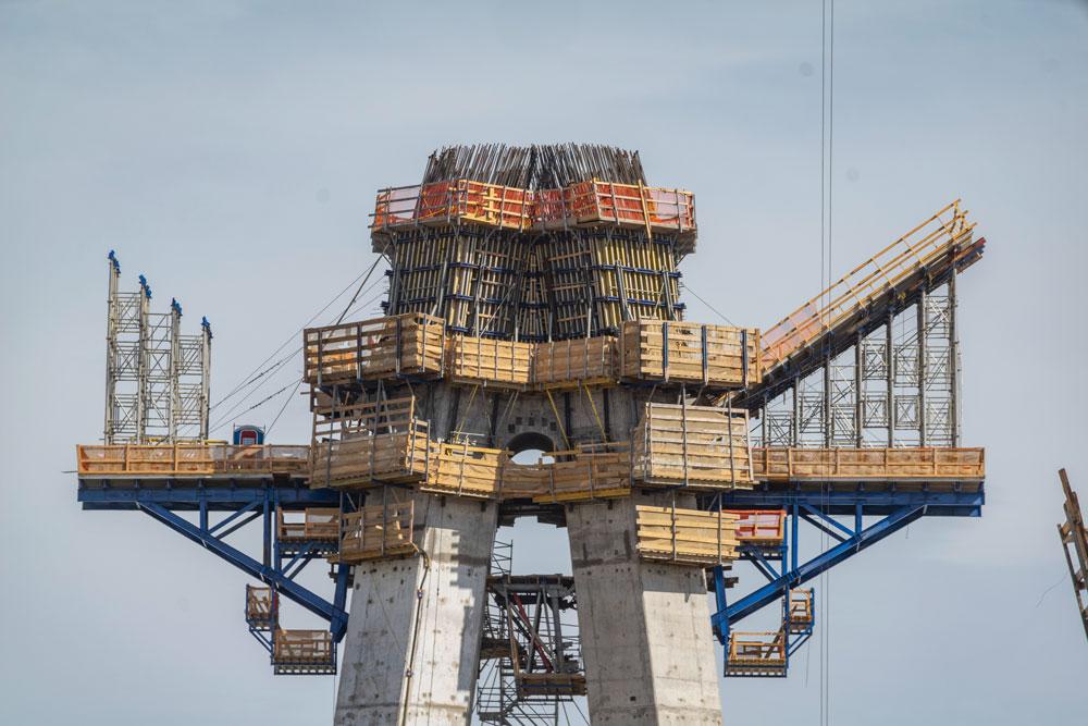 The scope of Doka’s part of the project includes two pylons and over 100 piers (with foundations) for the approach roads to the main span. The piers have overall heights of up to 45 m and approximately 4.50 metres pouring height. There are five different types of piers, varying in their external appearance and their execution – solid or hollow cross-sections.