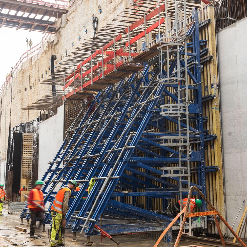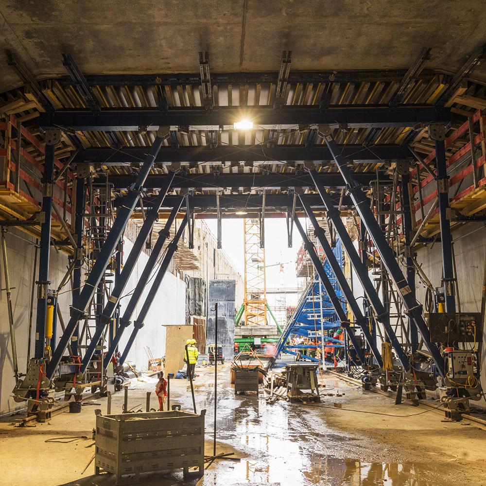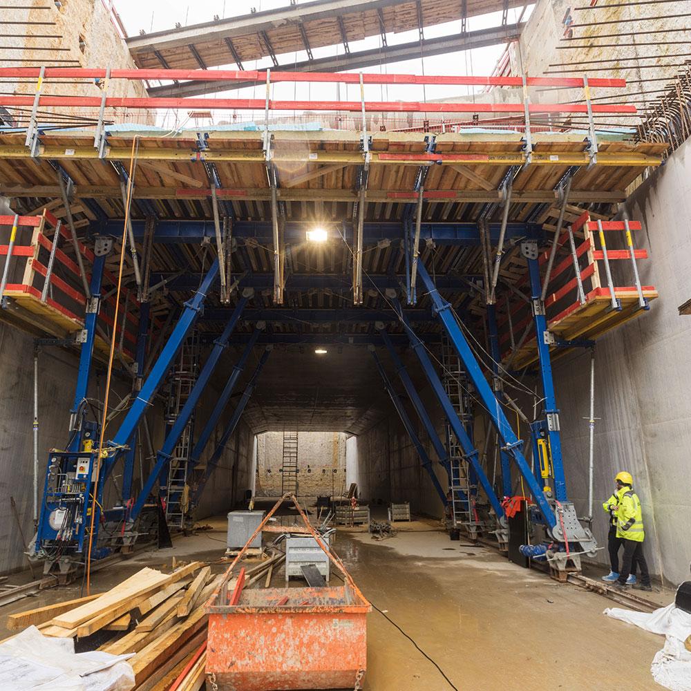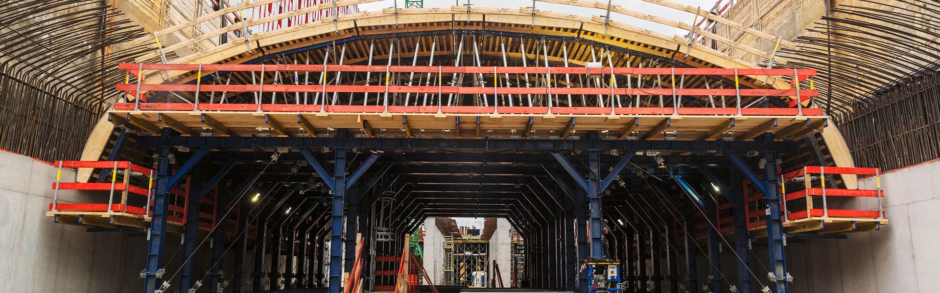 • cost-effective combination of Heavy-duty supporting system SL-1 and SL-1 LW as forming traveller for the vaulted roof of the station, and 2 Forming travellers DokaCC for the typical cross-section of the tunnel