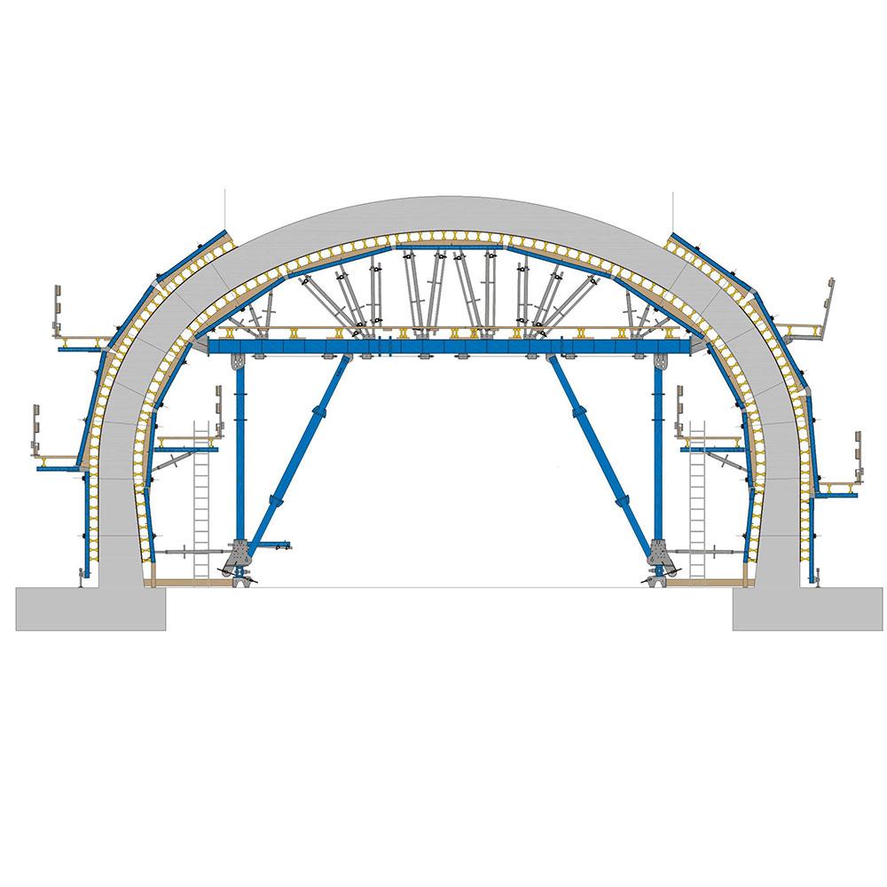 Faced with these varying challenges, the contracting consortium opted to use different tunnel forming systems. 240 metres of the tunnel were excavated by mining, 80 metres were cut-and-cover. For the mined tunnel Doka supplied a special construction: a reinforcing carriage measuring 12 metres in length. It is followed by a steel forming carriage built by cooperation partner CPT for casting the tunnel vault. Then come three post-casting travellers (30 metres for provision of site materials), also special constructions, for the post-casting finishing of the tunnel's inner shell. Each carriage consists of a movable heavy-duty supporting system built from Top 100 tec components and a supporting structure of walings and scaffold tubes. Even though they were designed specifically for this tunnelling job, the special constructions consisted of 95% rental material. The broadest DokaCC formwork traveller anywhere in the world was used for the tunnel's round southern portal, which is almost 15 metres wide. The tunnel's longitudinal gradient between the northern and southern parts runs at 3 %. This did not pose a problem, because the tunnel systems have electric drive motors and four hydraulic cylinders to raise and lower the carriages.