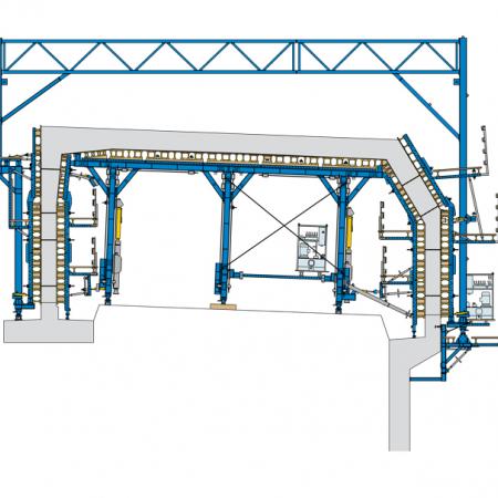 The 910 m long Amras motorway enclosure is being built with a twin-tube cross-section. The tunnel tubes are being cast in alternate sequential sections using two all-hydraulically controlled Doka tunnel formwork travellers.