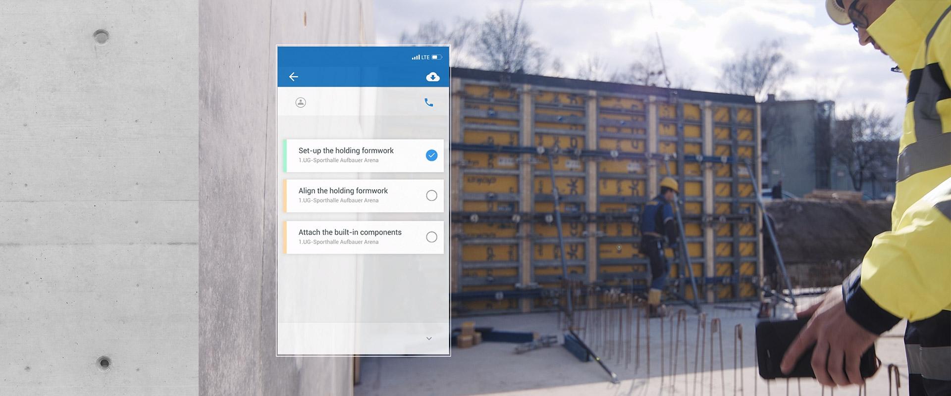After planning, the next step is implementation. Each day CONTAKT provides foremen with the operational steps to be completed by the end of the day. They then brief their crews. Each team’s charge hands start their current jobs on the smartphone and finalise them via smartphone upon completion. In addition, sensors on the formwork measure the progress on the job, provide feedback and thereby supply the person in charge of construction with a valuable basis for making decisions for subsequent cycles: target and actual situation are compared. Predefined approvals allow foremen to verify correct implementation or to intervene with corrective measures.