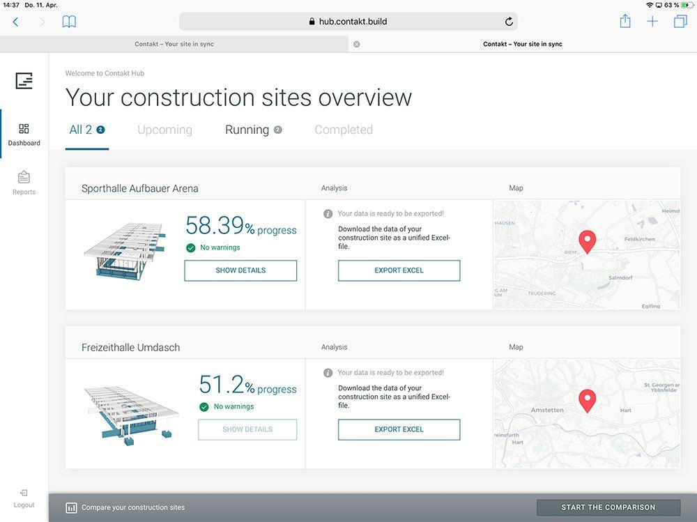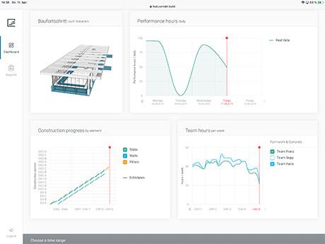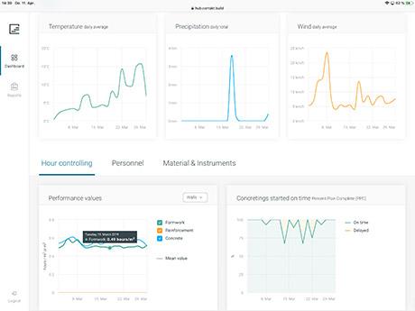 Any data and times collected are processed by CONTAKT in the “Hub”. This is where the precious data is stored: all construction sites of a company report in real time and in a uniform manner. This way the data can be used for comparison. It allows for checking metrics such as subcontractor performance or measuring the impact of changes in the weather. Another benefit is that suitability of different materials such as the type of concrete or the formwork system used can be tested and optimised. This way deviations can be detected early enough for counter measures to be taken before much money is invested or time lost.