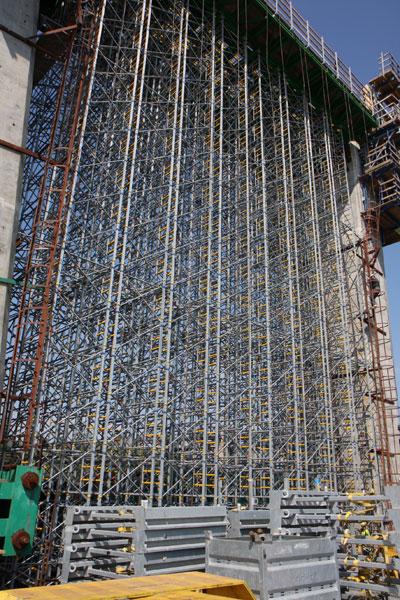 La viga transversal de 6 m de altura y 20 m de longitud de sección hueca sirve como apoyo para el tablero del puente y se realiza con los elementos de grandes superficies del encofrado de vigas Doka Top 50. Esta construcción del encofrado se apoya a una altura de casi 25 m con la cimbra Staxo 100 de montaje rápido y sencillo. Las escaleras integradas y un gran número de posibilidades de suspensión para el equipo de protección personal hicieron posible un montaje rápido y, sobre todo, seguro de las torres de cimbra. Después de las vigas transversales, las plataformas de autotrepado se adaptan al nuevo ángulo de inclinación de 5,6 grados con respecto a la vertical. Además, una pasarela (catwalk), suspendida en el sistema de autotrepado, une las dos patas del pilono. De este modo, por cada pilono solo se necesita un ascensor para llevar al personal de la obra a su lugar de trabajo. Esta pasarela es una solución especial desarrollada por Doka para este proyecto que, gracias al desmontaje sencillo de segmentos que ya no se necesitan durante el proceso de construcción, se puede adaptar perfectamente a las patas del pilono inclinadas hacia fuera y después hacia dentro.
