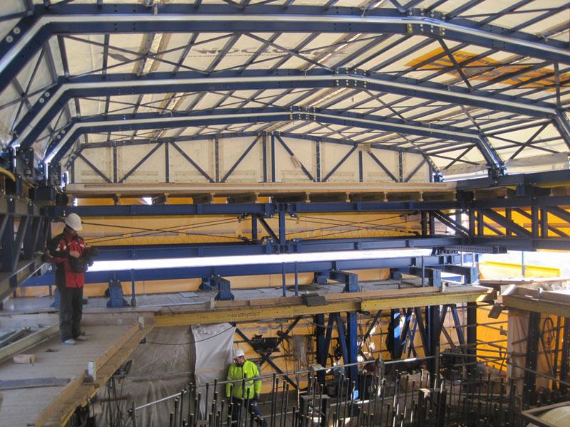 El anclaje permanente de las ménsulas de trepado a la construcción hizo posible un desplazamiento sin grúa y seguro del encofrado y las plataformas, casi con cualquier situación atmosférica. Unos requisitos especialmente estrictos para conseguir una resistencia del hormigón óptima hicieron necesaria otra innovación técnica del encofrado. El hormigón in situ debía curarse durante cuatro días dentro del encofrado cerrado, solo después se podía abrir el encofrado. Con el fin de garantizar un vertido de hormigón con resultado de alta calidad incluso a bajas temperaturas, Doka envolvió los siete niveles de plataformas con una lona para andamios resistente y construyó un tejado consistente en siete segmentos. De este modo el lugar de trabajo estaba completamente cerrado y se pudo calentar en invierno. En el caso de temperaturas exteriores elevadas y para colocar el acero de la armadura, los diferentes segmentos del tejado se enrollaban en rodillos. La elevada capacidad de adaptación de SKE a las diferentes formas geométricas e inclinaciones fue en este proyecto otra ventaja, porque la sección máxima de cada pata del pilono se estrechaba, pasando de 13 m en la primera tongada, a 7,5 m en la tongada número 71. También el espesor del muro iba disminuyendo paulatinamente de 2,0 m a 0,75 m. Mediante plataformas telescópicas y elementos de encofrado de vigas de reducción sencilla tuvo lugar rápidamente la adaptación gradual en cada tongada.