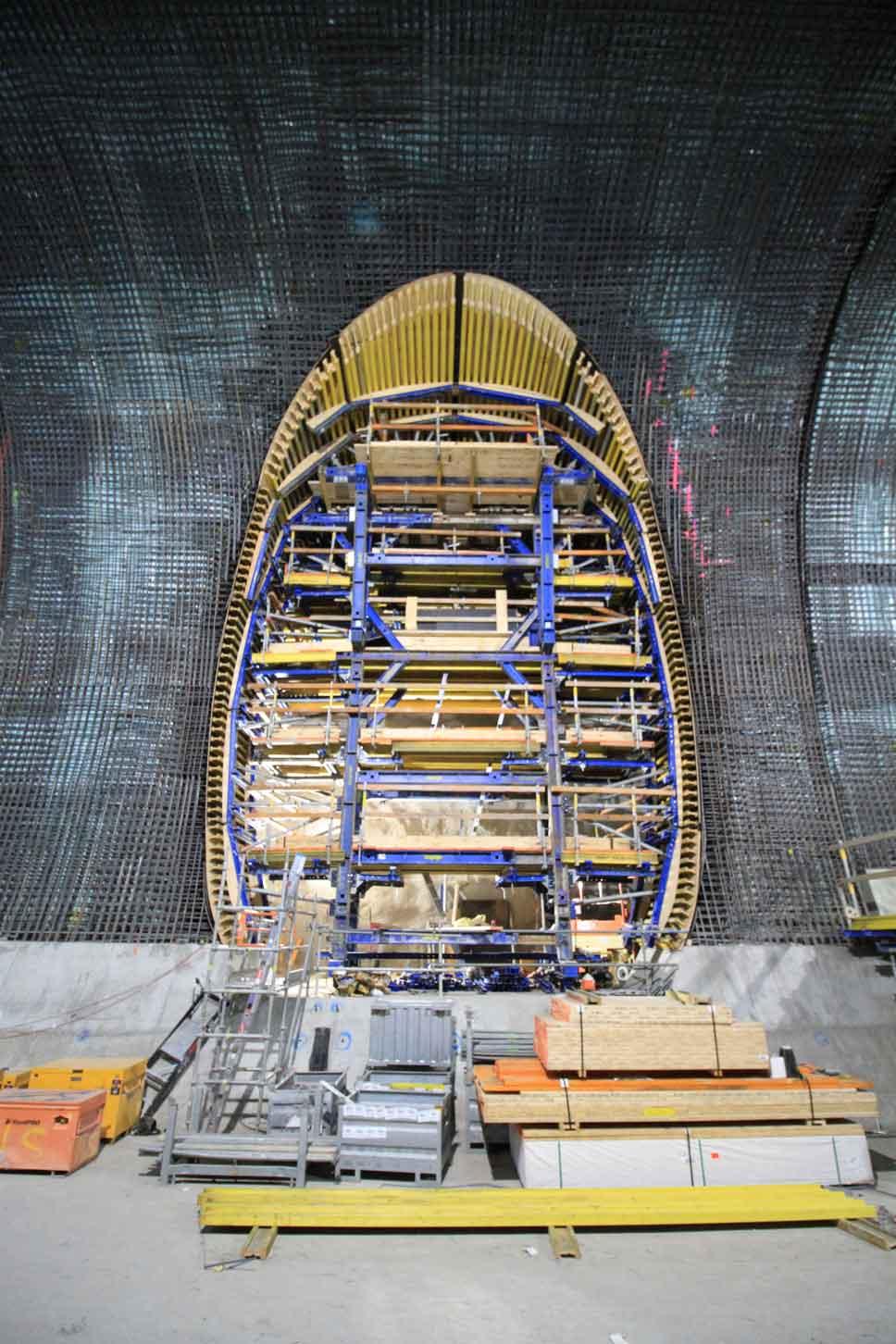 Ce projet a permis à DOKA de présenter son étaiement SL-1 : un système modulaire fournissant des solutions complètes de coffrage pour les sections de tunnel les plus variées, quelles que soient leur forme ou la charge. Ce système peut être adapté à toutes les situations. Il est possible de disposer les poutres, filières et butons du système SL-1 selon diverses configurations, ce qui permet un usage optimal de l'ensemble de l'équipement, le tout avec des temps de montage réduits et des composants d'étaiement. Des systèmes de sécurité intégrés garantissent une sécurité optimale sur le lieu de travail, notamment grâce aux passerelles de travail et aux accès intégrés.