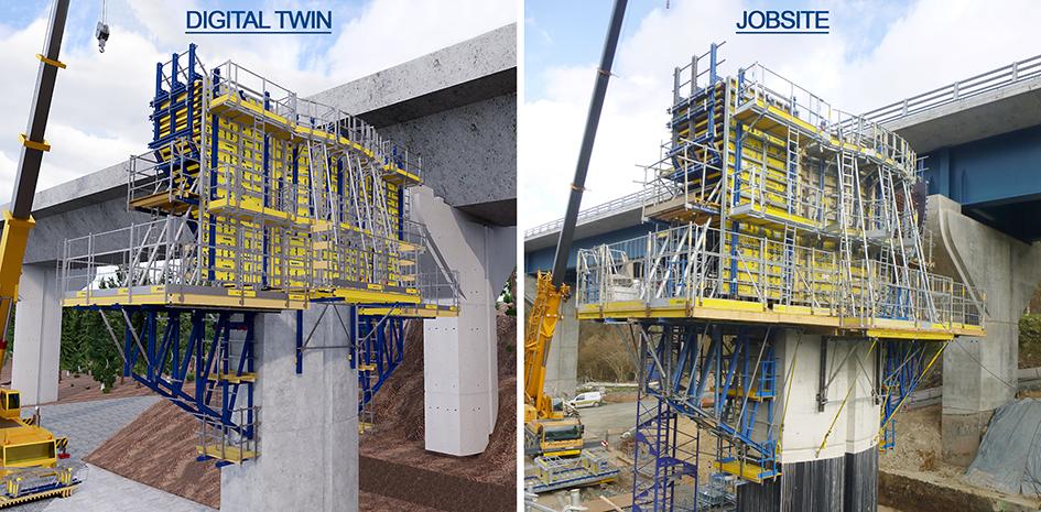 Avec le modèle 3D, le client n’est pas seulement capable de simuler le processus de construction avec le « jumeau » numérique, il peut également effectuer rapidement et facilement des tests de collision entre les différents métiers représentés sur le chantier et visualiser leurs interactions. Les travaux de renforcement et de coffrage, le lieu de stockage des matériaux, l'utilisation de grues et le personnel doivent être parfaitement coordonnés pour assurer le bon déroulement des travaux. C'était un aspect important lorsque les têtes de piliers ont été formées, car l'espace était un bien précieux. Il était donc crucial de voir exactement comment le montage du coffrage pourrait être effectué à côté du pont existant, sans avoir à faire de modifications compliquées durant les travaux de construction.
