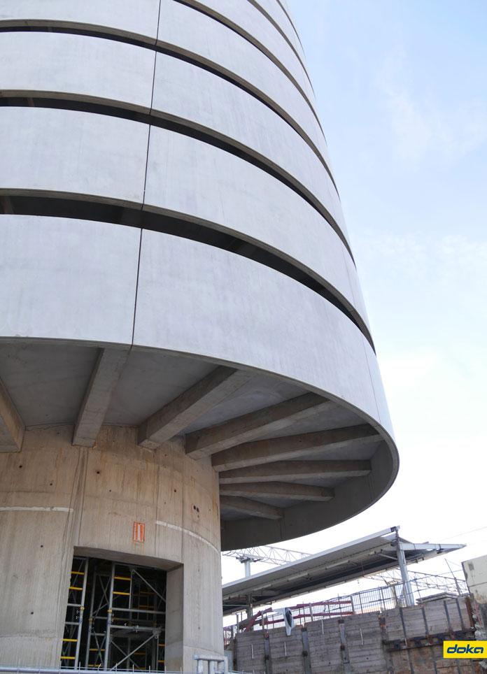 Des étais Eurex 30 et Eurex 100 ont été choisies pour soutenir à chaque niveau d’hélice les poutres préfabriquées et le béton coulé entre ces dernières. La charge étant tellement importante, tout le dispositif d’étaiement a dû être maintenu intégralement sur la structure jusqu’au séchage complet de l’hélice, afin de pouvoir maintenir toute cette descente de charge depuis le bas jusqu’en haut et d’attendre le dernier décofffrage pour être retiré.