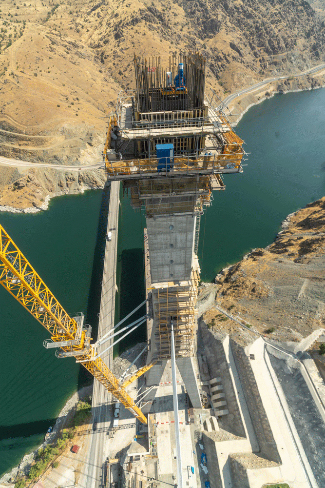 Construit au-dessus du lac du barrage de Karakaya, le pont de Kömürhan constituera bientôt un tronçon de la route nationale Malatya-Elazig dans l’Est de la Turquie. D’une longueur de 600 mètres, le pont est constitué d’une structure à haubans, avec un pylône unique de 165 m de haut. Ce pont d’un genre particulier est le quatrième pont à haubans à pylône unique au monde, et il jouera également un rôle important sur le plan régional en tant que corridor logistique. Non seulement il reliera Malatya et Elazığ, mais il servira également de point de passage stratégique pour les 16 provinces d’Anatolie orientale.