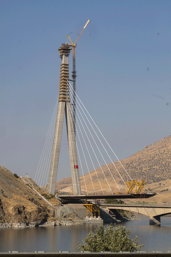 La province de Malatya se situe à environ 700 kilomètres à l’Est de la capitale turque Ankara et à 400 kilomètres au nord de la frontière syrienne. La région est célèbre pour ses abricots, et dorénavant, parce qu’elle compte le plus haut pylône du pays. Haut de 168,5 mètres, ce pylône en béton armé en forme de « Y » est la pièce maîtresse du nouveau pont de Kömürhan, une structure suspendue traversant la rivière Fırat et la frontière entre les provinces de Malatya et Elazığ. Le pont, qui fait un peu plus d’un demi-kilomètre de long – 660 mètres –, présente une ouverture libre de 180 mètres aux extrémités, une portée de 380 mètres au milieu et a une largeur de 24 mètres. Ce pont fera partie d’une route à quatre voies de 5 225 mètres, qui comprend un viaduc de 120 mètres et un tunnel de 2 400 mètres, permettant de rejoindre le barrage de Karakaya, quelques kilomètres plus au Sud. Le vieux pont existant et les routes mal reliées seront conservés. Le nouveau pont et le tunnel seront construits à côté de la route existante.