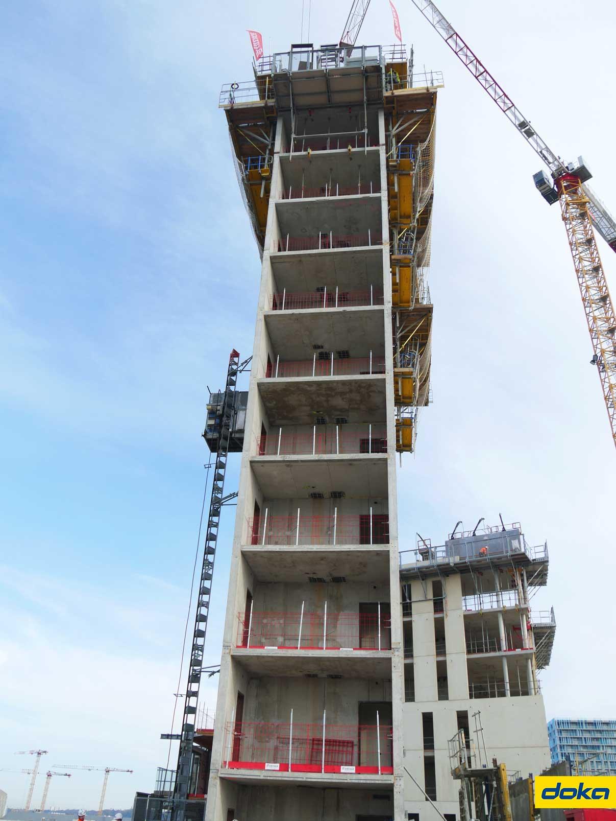 console MF 240 et des nacelles, le choix pour réaliser la partie béton de la Tour Hypérion s’est fait après avoir travaillé sur le plancher avec DOKADEK 20. Et les obligations du chantier sont multiples : les angles, les vis à bois à fixer sur la peau coffrante, éviter d’avoir des reprises bétonnage en coulant le béton en un seul tenant, tenir de fortes cadences, etc.