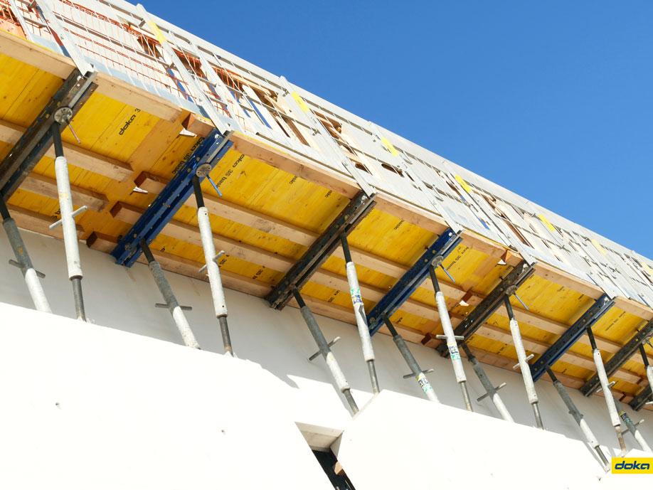 - La passerelle de coffrage de rive : « notre outil interne ne convenait pas car trop grand en dimension. Nous avons donc pensé en premier à passer sur des tours avec une solution de platelage, mais le bureau d’étude de Doka Marseille nous a proposé la passerelle et je dois dire que nous en sommes très satisfait. Elle se positionne pile où il le faut et s’adapte facilement. On peut travailler en toute sécurité surtout.»
