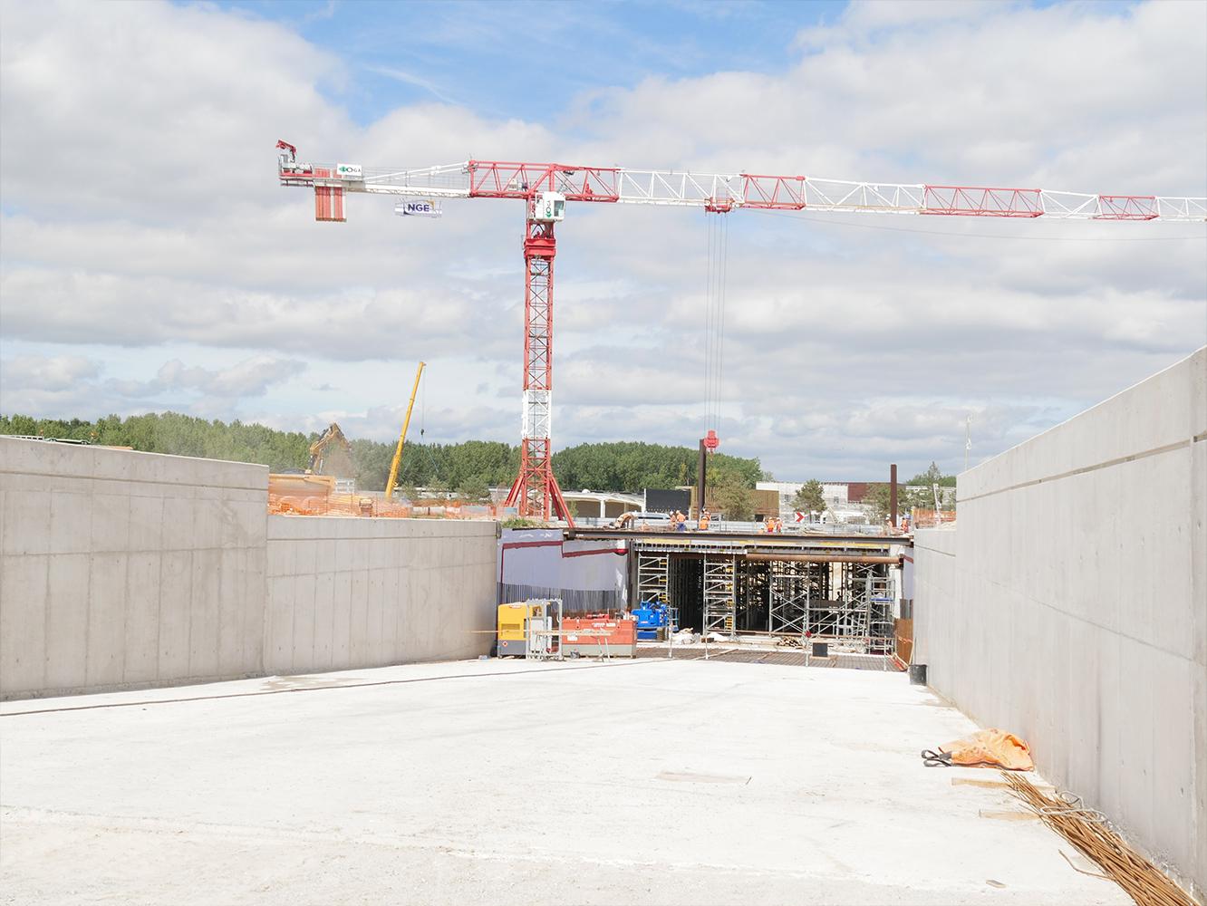 Pour ce chantier multi-métiers, les travaux commandés par la Mairie de Claye-Souilly sont réalisés par le groupement NGE. L’ouvrage représente plus de 5000 m3 de béton. Les 250 m de palplanches, les fondations, et les 30 000 m3 de terrassement ont d’abord été réalisés. Puis place au génie civil, avec la construction du radier créé sous l’ouvrage été 2019. Une fois la plateforme stable et les voiles coulés, c’est au tour de l’étaiement pour la création du tablier avec la Staxo 100.
