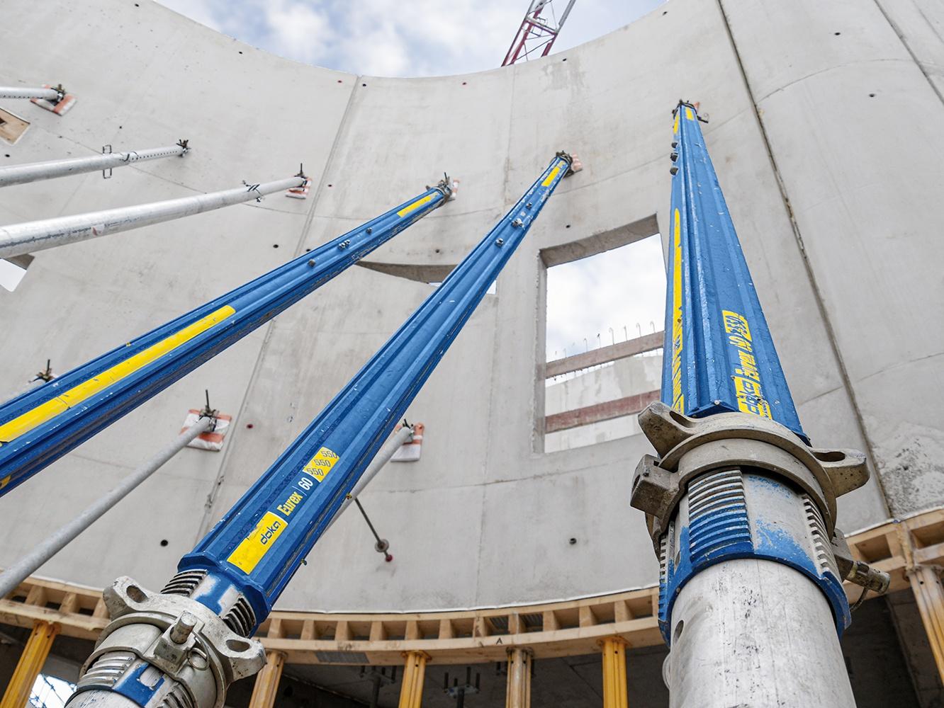 Eurex 60 est idéal pour le coffrage de dalles et de balcons. Avec une force portante de 60 kN pour une hauteur allant jusqu’à 5,50 m (jusqu’à 11 m avec une force portante réduite), il est extrêmement robuste. Cet étai convient également pour les voiles en grande hauteur (zone d’extension jusqu’à plus de 13 m) et en préfabriqué.