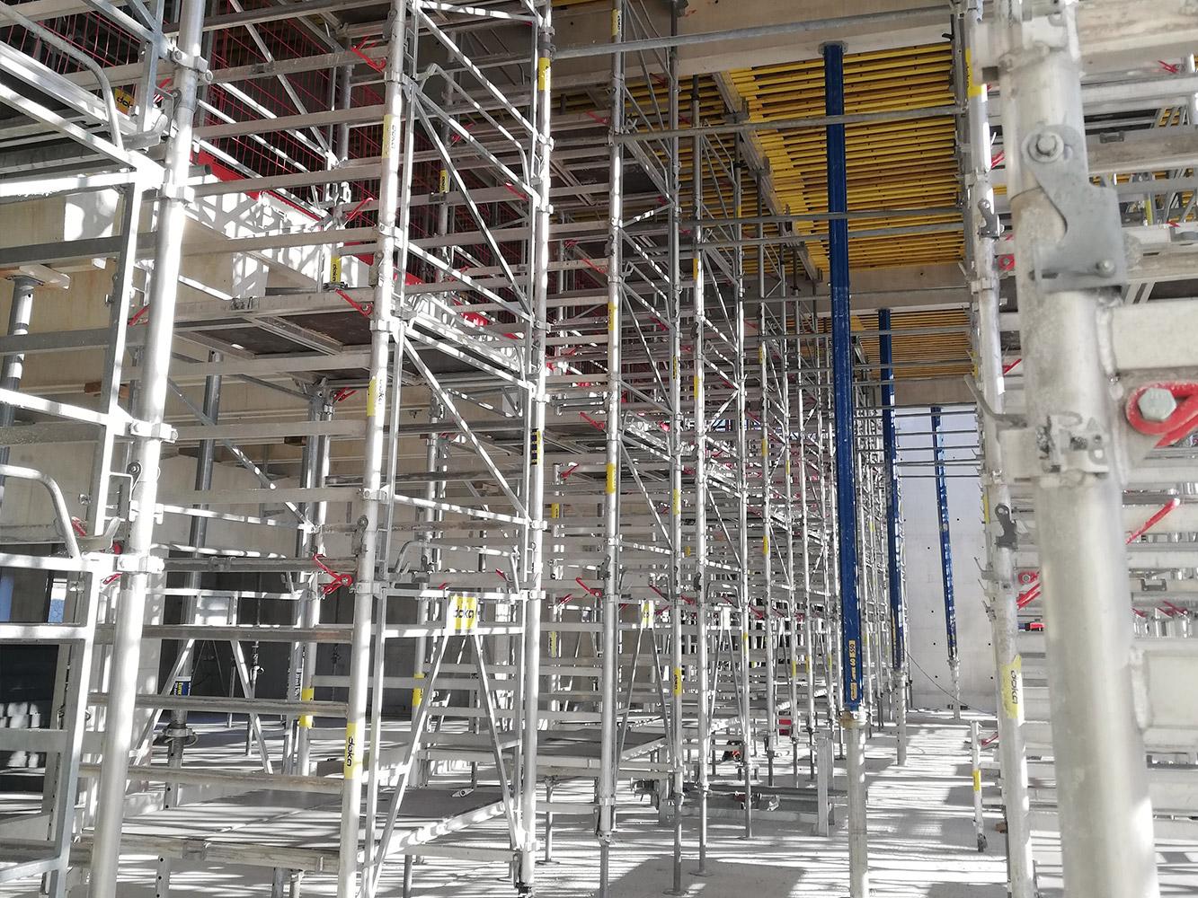 Pour la conception du dernier étage, un platelage général de travail devait être conçu afin que les compagnons puissent avoir une zone de travail sécurisée, mais aussi venir réceptionner les poutres en préfabriqués de 8 m de long et 30 t chacune. Ce platelage a été réalisé grâce à la Tour Excellence qui a pu rependre ces charges importantes. « Nous avons choisi cette tour d’étaiement car elle est légère avec sa composition en aluminium et on peut travailler totalement en sécurité avec ces garde-corps incorporés. Elle est aussi très pratique avec un montage et démontage simple. Intuitive, même des compagnons qui n’ont encore jamais travaillé avec se forment en peu de temps pour l’utiliser ».