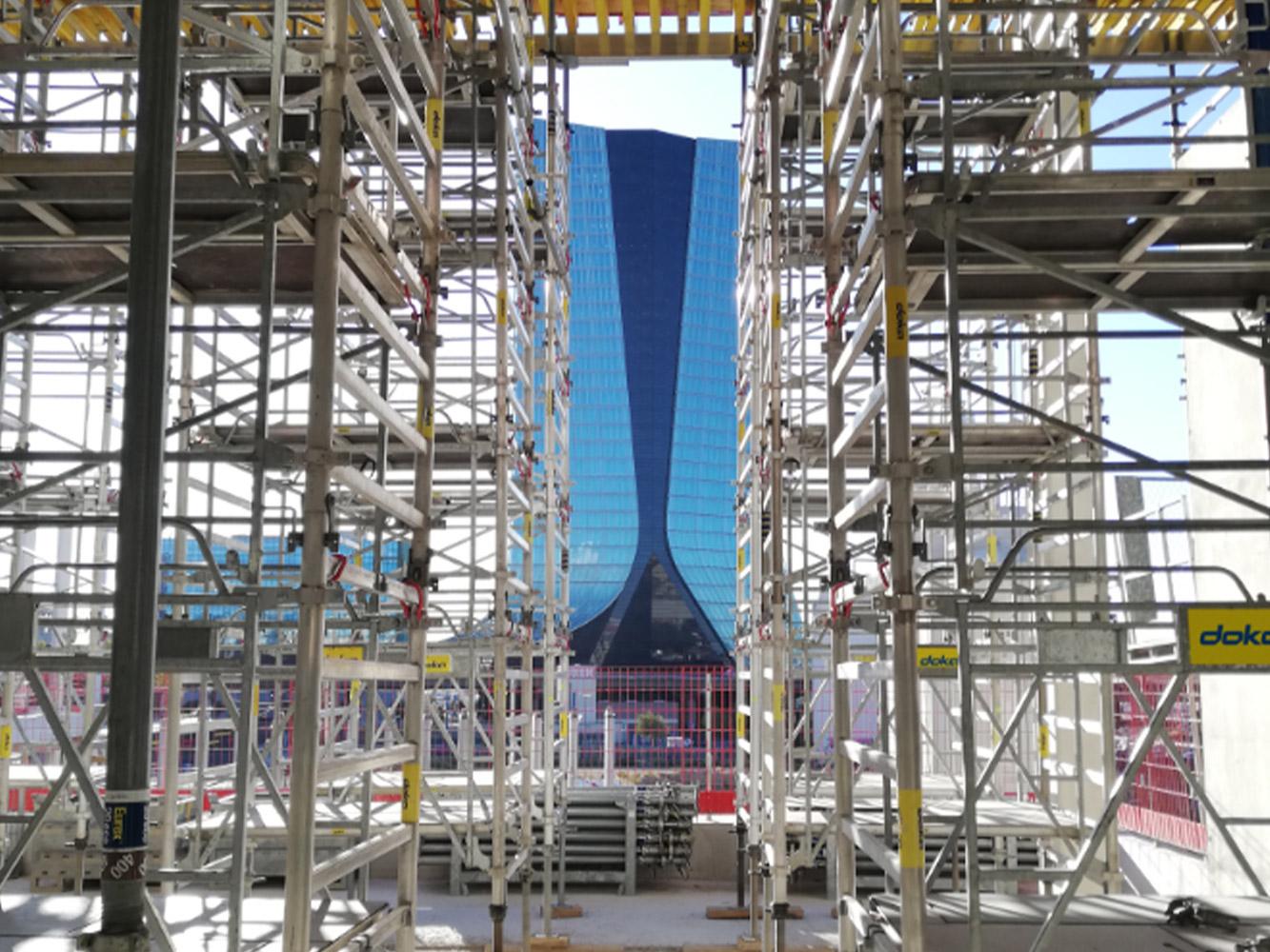 Concernant les tables coffrantes, elles ont servi pour coffrer des portes à faux du bâtiment allant jusqu’à 3.5 m. Au total 14 tables ont été utilisées, soit 190 m². « Au début nous étions partis pour prendre de la tour, mais cela demandait d’avoir beaucoup de matériel et surtout de la place. Nous avons donc choisi la Table Dokamatic, un outil qui permet de travailler plus en sécurité qu’avec une tour, mais aussi nettement plus rapide à mettre en place ».