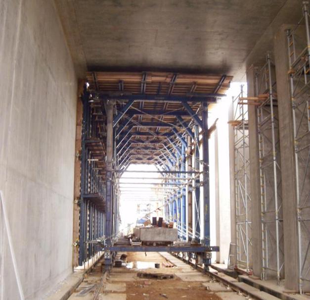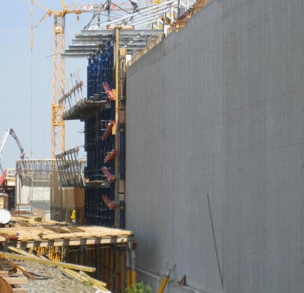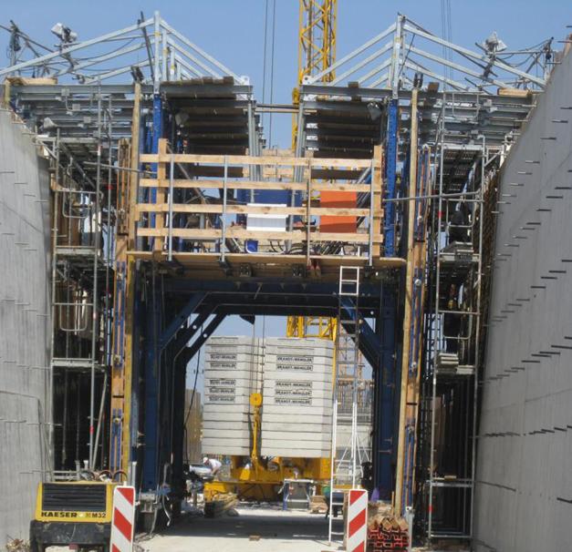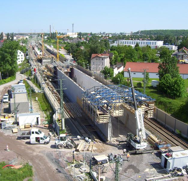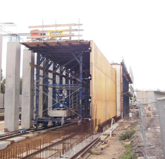 Doka je isplanirala oplatu za 3 građevinska elementa željezničkog nadvožnjaka na južnoj spojnoj pruzi u Halleu. Jedna oplatna kolica za oplaćivanje zidova s gredama oplatnih kolica T za dva paralelna potporna zida. Jedna složena oplatna kolica za konzolne ploče i kape na vijencima zidova i jedna oplatna kolica za oplaćivanje tunela na hidraulički pogon za građevinski objekt rampe s tlocrtom u obliku slova X.