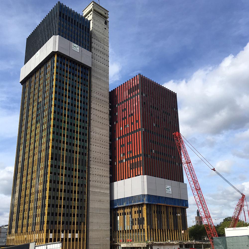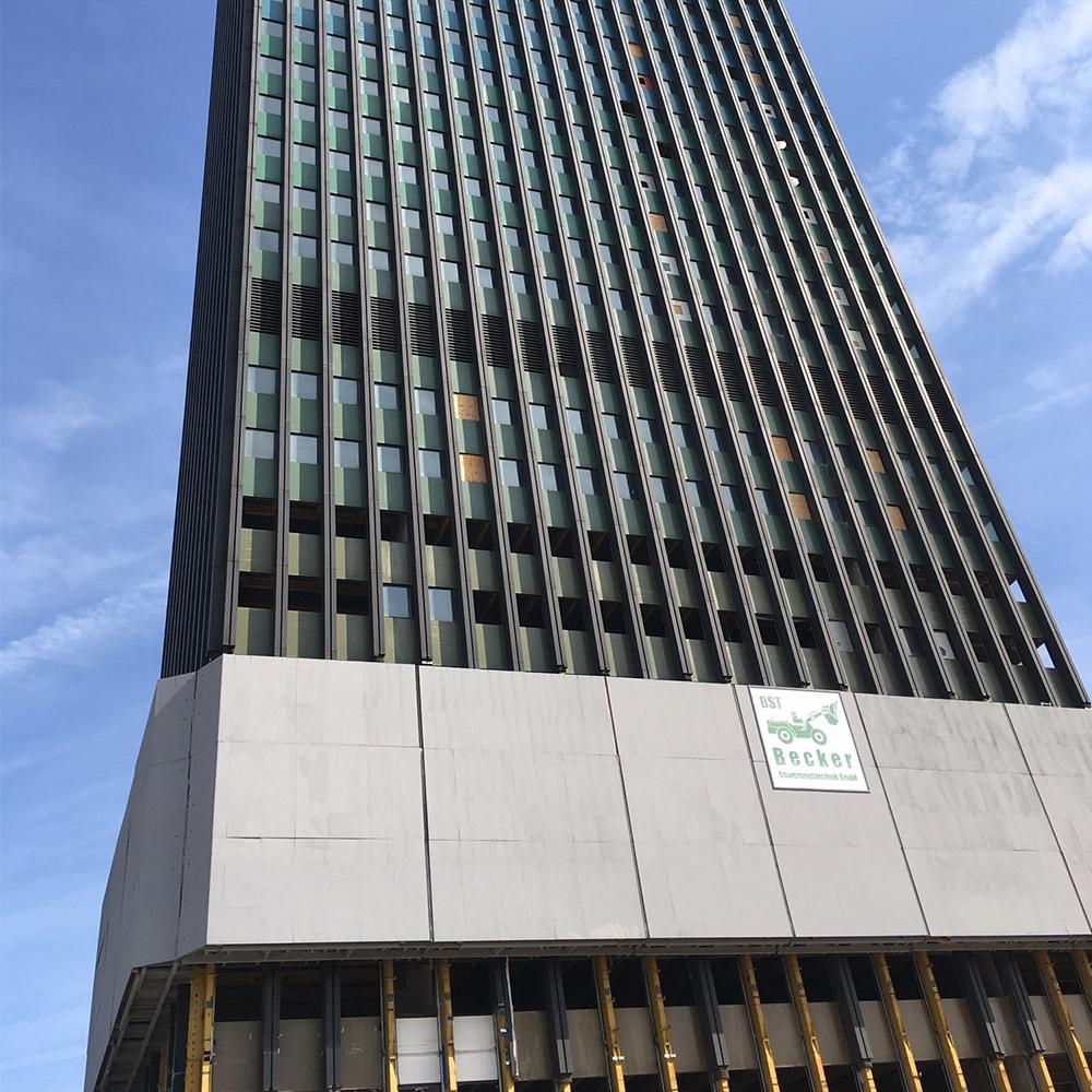 2019 májusában megkezdődött a munka, a homlokzat aluminium lemezeinek és azbeszt szigetelésének eltávolításával, melynek során – így már a bontási munkafolyamatok első munkafázisaitól, már a felfelé kúszó szakasztól kezdve – hasznát vették a védőpajzsnak. A BST Becker csapata a védőpajzs mögötti munkaplatformokat használta az oszlopok és ablakelemek burkolatához való hozzáféréshez.