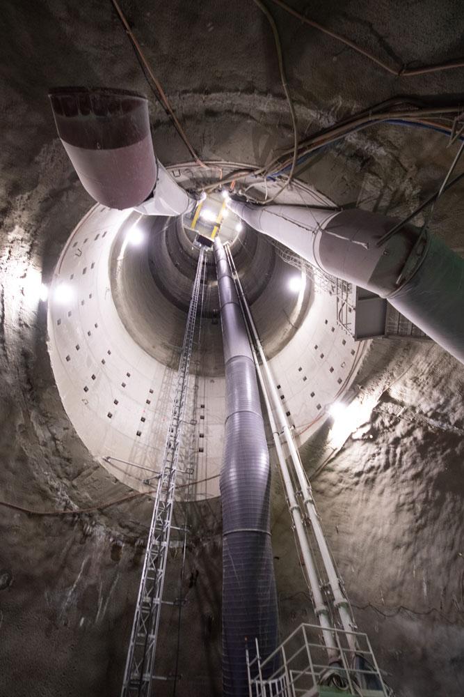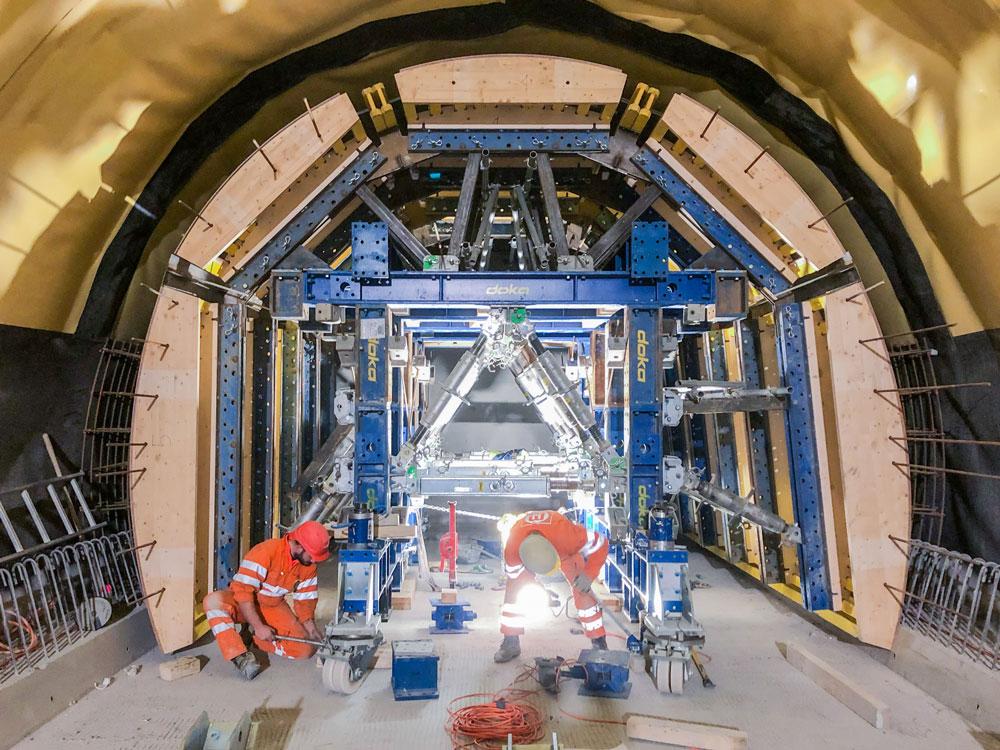 A Doka boltozat zsaluzatát tervezte meg négy darab 50-70 cm hosszú kereszt-szakaszon, a hagyományos zsaluzási technikákat és három zsalukocsit is bevonva. A legnagyobb ezek közül az SL-1 alagút zsalukocsi, amely hossza 10 m, átmérője pedig 6.30m. Ezt a zsalukocsit úgy kellett megtervezni, hogy hosszirányban tagolható legyen, hogy a szűk aknán keresztül lejuttatható legyen a tényleges munkaterületre – ez egy szabványos alagútépítési terület esetén nem okozott volna problémát. Mérnökeink ennek megfelelően 4 darab 2.5 m széles lemezt terveztek, plusz tartozékokkal, amelyek a darura illeszthetők voltak. Az 50 t állványzat így, alkotórészenként került a mélybe, ahol markológépekkel a munkaterületre szállítják és a helyére szerelik, ahol használatra kész.