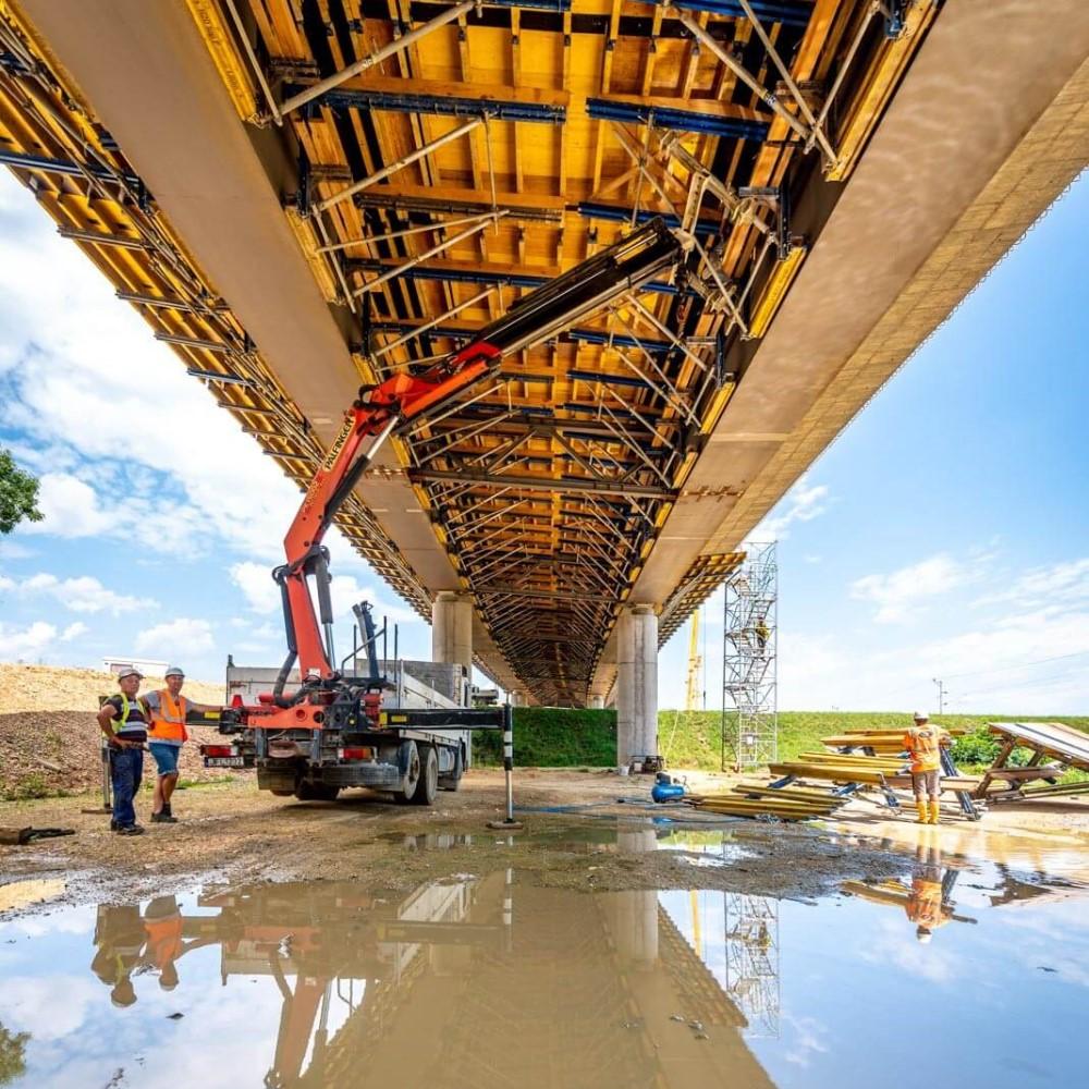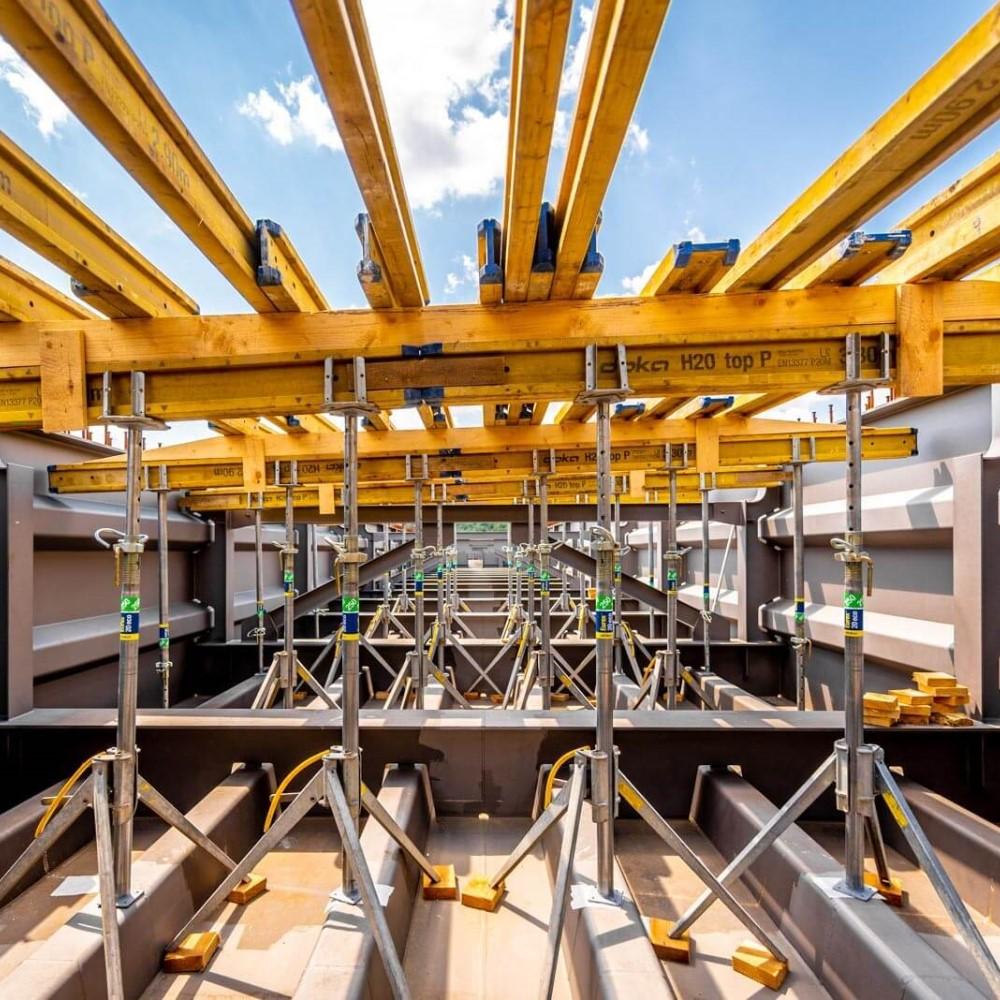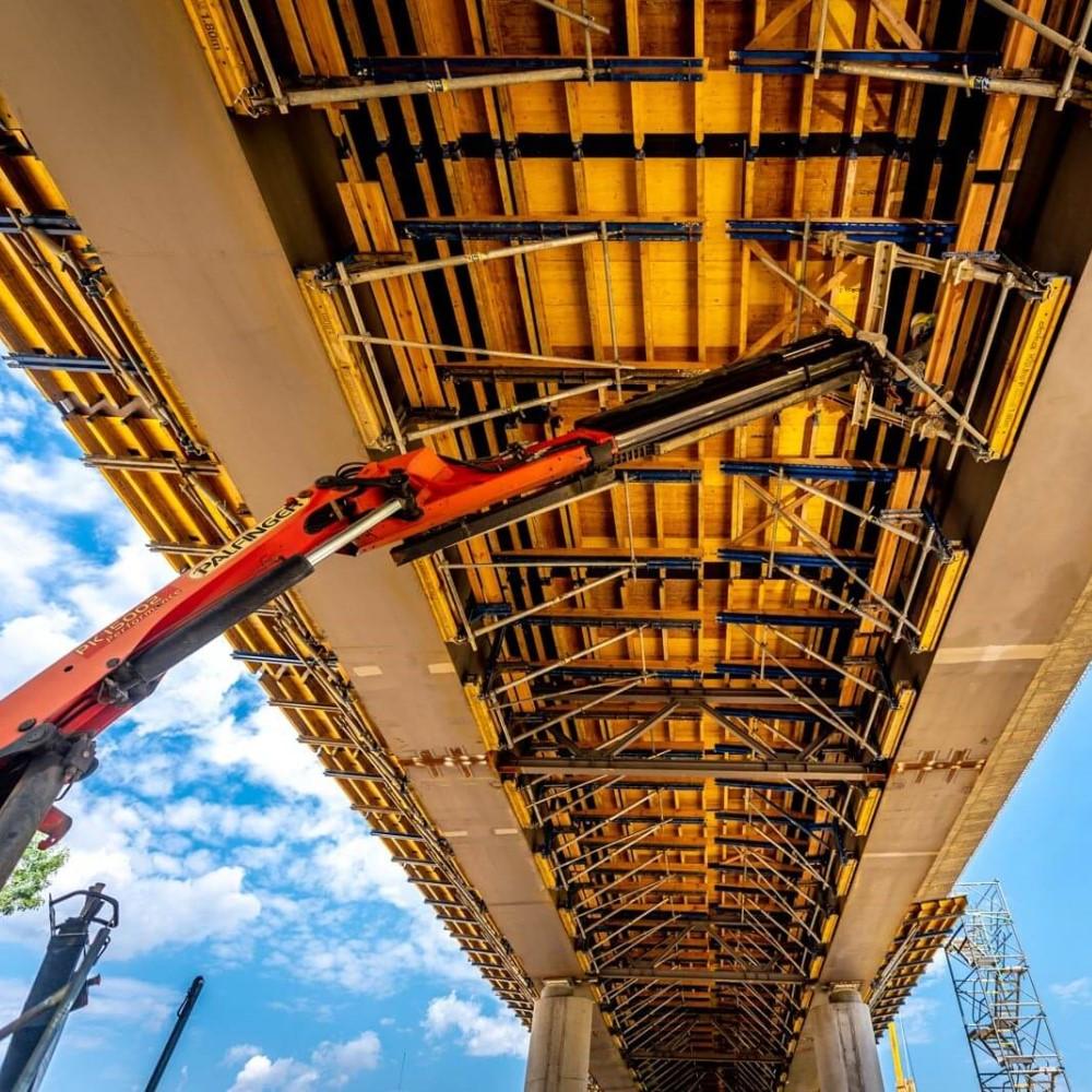 Összesen három ütemnyi zsalukészlettel dolgoznak a hídon, az egyik ütemen a zsaluzás, a másikon a vasszerelés, míg a harmadikon a betonozás készül. A piacon a Doka termékei passzoltak leginkább az elképzelésekhez műszakilag, kezelhetőség és a költségek szempontjából is. A pályalemez főtartón túlnyúló részének alátámasztására olyan konzolpárokat függesztettek az acél főtartóra, amelyek szétszerelés nélkül leszedhetők és tovább vihetők a következő ütemre.