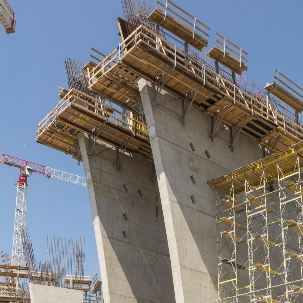 A látszóbeton pilonok kivitelezéséhez a szerkezetépítő alvállalkozók mintegy 300 db MF 240 típusú kúszózsalu egységre épített Top 50 fatartós falzsalut használtak.