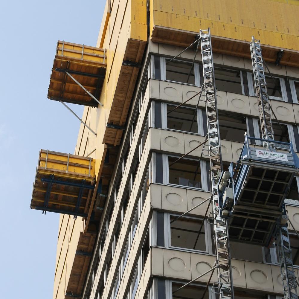A bontás során az Xclimb 60-at, a Doka egyik univerzális kúszó rendszerét használták, amely akár daruval, akár hidraulikával is áthelyezhető. A pajzs tervezésének legfontosabb fázisa a legalkalmasabb felfüggesztési megoldás kiválasztása volt. Az első épületrészek bontása során felbukkant – addig ismeretlen – információk alapján, a legcélszerűbb megoldás a pajzsot tartó papucsok befüggesztése volt, így elkerülve a mellvéden átemelt nehéz és bonyolultan áthelyezhető megoldást, valamint a mellvédfalak fúrását. A szerkezet súlya miatt egyedi elemek és rendszerelemek kombinálásával készülhetett el a végleges felfüggesztés, amelyet a felső födémről csörlő segítségével emeltek fel.