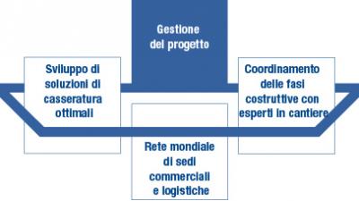Ogni cantiere attraversa varie fasi nel corso del processo di costruzione, dalla progettazione all'ultimazione dei lavori. Avere la possibilità di essere coinvolti nel progetto fin dalla fase iniziale, significa potere comprenderlo meglio ed aumentarne l'efficienza. Possiamo accompagnare i nostri clienti in ogni fase del progetto di casseratura, perché siamo in grado di fornire prodotti, servizi, progettazione, gestione del progetto e servizi di logistica. Tutto ciò che serve da un unico fornitore! Sono poche le aziende che possono assicurare questa "comprensione di tutti gli aspetti di un progetto"!