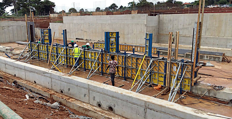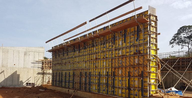 Ricordo che in sostanza che il muro è assimilabile al calcestruzzo faccia-a-vista e quindi Doka ci ha dovuto garantire con i suoi casseri anche un’ottima finitura superficiale del manufatto. Anche in questo caso abbiamo realizzato una serie di prove sul campo, in questo caso in Italia, a Maranello, dove abbiamo verificato il getto della miscela nei casseri Doka per valutarne in concreto il risultato. Risultato che ovviamente ci ha convinto e che è stato poi replicato a Entebbe (i muri ormai sono completi e tutto è andato secondo programma).