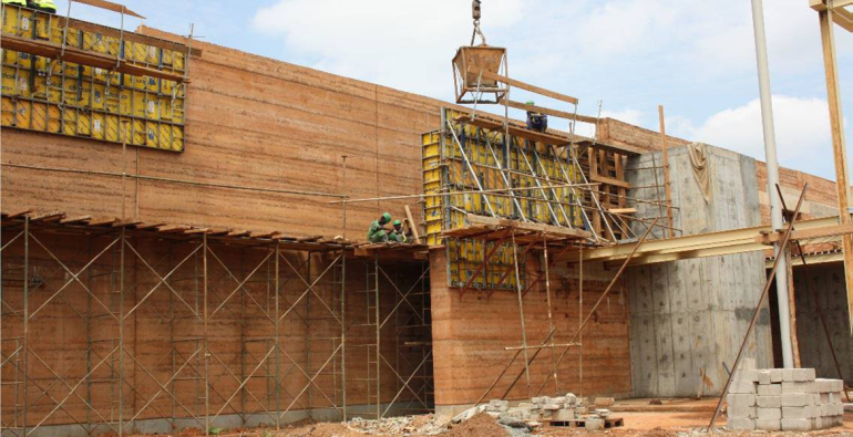 Oltre alle fondazioni in calcestruzzo, i casseri Doka, come accennavo, si sono dimostrati perfetti per la realizzazione dei grandi muri in pisé; la tecnologia della terra compattata è infatti ampiamente utilizzata per realizzare manufatti architettonici in tutto il Mondo, ma a Entebbe avevamo l’esigenza di spingerci oltre, realizzando muri decisamente grandi da una parte e dall’altra garantendo che tali strutture non si sarebbero degradate nel tempo.
