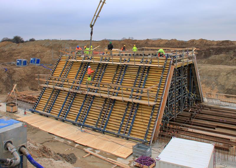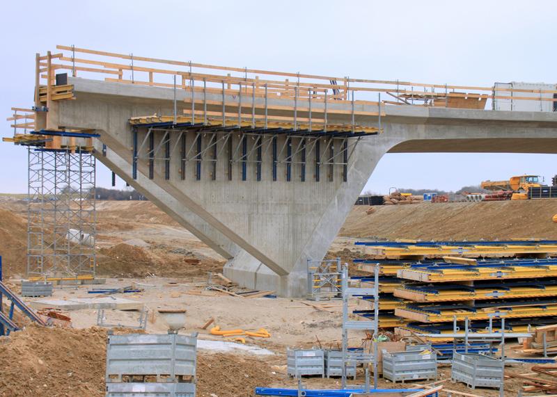 The assignment may sound relatively simple at one level – constructing 72 bridges, 10 of them conventionally reinforced and 11 of them pre-stressed frame constructions – yet the differing geometrical and construction-engineering requirements make careful implementation quite a challenge. On top of this, there are the tight deadlines, which have to be met without fail. This all calls for thorough and conscientious formwork planning that takes account of all boundary conditions.