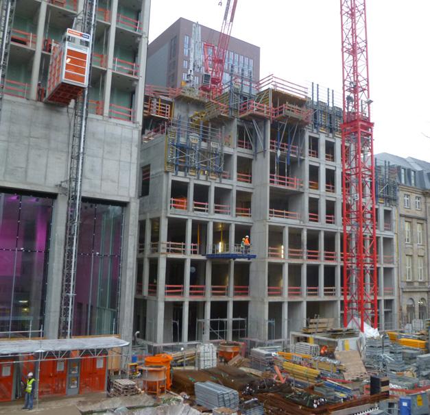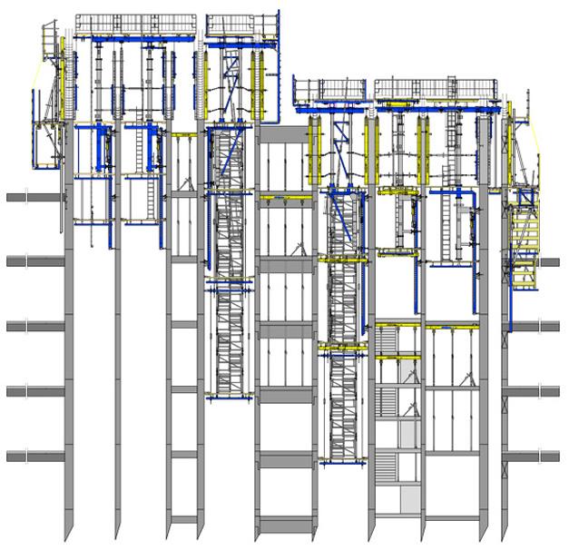 Use of an ideal mix of SKE100 and SKE50 plus automatic climbing formwork allowed for rapid and economic progress in the core construction. Our protection screen Xclimb 60 with framed enclosure Xbright ensured maximum safety and sealing tightness in the facade area.
