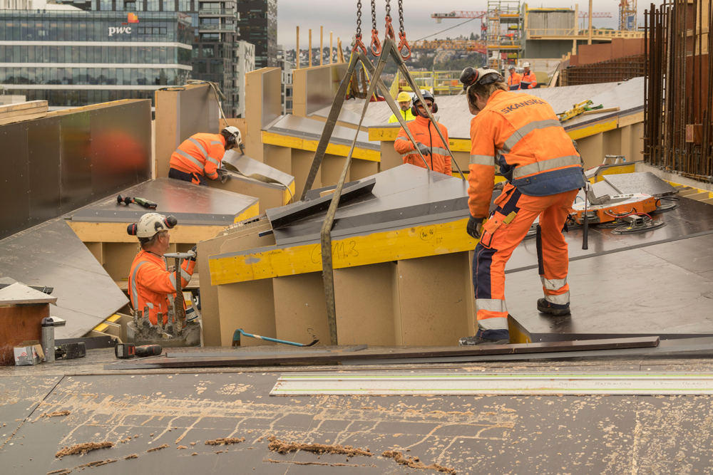 Voor de buitengewone dakconstructie van de bibliotheek produceerde de Doka-prefabricatieservice in Amstetten 526 bekistingsboxen met een totale oppervlakte van 2.600 m². “De medewerkers van Doka hebben zeer professioneel werk geleverd, vooral ook met betrekking tot het design. Ook de productie bij Doka was uiterst nauwkeurig. De verschillende bekistingsboxen werden zonder productiefouten op de bouwplaats afgeleverd”, zegt Nils Skinnarland, bouwplaatsmanager bij Skanska. De afzonderlijke bekistingselementen werden in een 3D-model vormgegeven en vervolgens met CNC-freesmachines (Computerized Numerical Control) uitgesneden. In totaal werden hierbij 1.080 tekeningen gemaakt en bijna 1.850 werkuren geïnvesteerd.