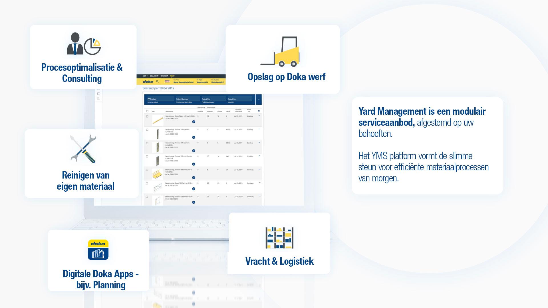 Tot op de dag van vandaag is ‘wie het eerst komt, het eerst maalt’ een gangbare manier van werken op bouwplaatsen. Voormannen hebben te maken met de onduidelijkheid en transparantie over beschikbaarheid van materialen. Uitvoerders hebben moeite om informatie te verzamelen over materialen die eigendom zijn en die momenteel worden gebruikt. Onze Yard Management Service is een intuïtief webgebaseerd platform dat hier inzicht in geeft. Een digitale weergave van alle gegevens met betrekking tot inventaris en bewegingen (gehuurd en eigen materiaal, bekisting en eventuele aanvullende producten) zorgt voor een intelligente materiaalstroom. Als bijvoorbeeld eigen materiaal op bouwplaats A niet wordt gebruikt, maar nodig is op bouwplaats B, kan de Yard Manager de overdracht gemakkelijk organiseren. Daarnaast biedt Yard Management Service automatische koppelingen naar traditionale diensten zoals transport, revisie en opslag die modulair kunnen worden geselecteerd.