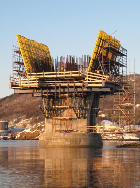 Do budowy trzech filarów mostu, na których zamontowano wózki do metody nawisowej, konieczne było wyjątkowo stabilne deskowanie- wysokie do 10 m fale sztormowe w fiordzie były prawdziwym sprawdzianem wytrzymałości. Deskowania dźwigarowe Top50 i FF20 sprostały jednak warunkom pogodowym przy budowie filarów. Podwójne filary wykonano w jednym takcie betoniarskim. W celu stabilizacji deskowania, wzniesiono platformy na fundamentach pod filarami, na które za pomocą wrzecion odprowadzano wysokie obciążenia wiatrem. Do budowy tych platform wykorzystano rygle CFT używane w wózkach do metody nawisowej i system SL-1.