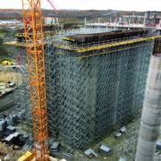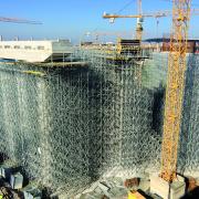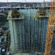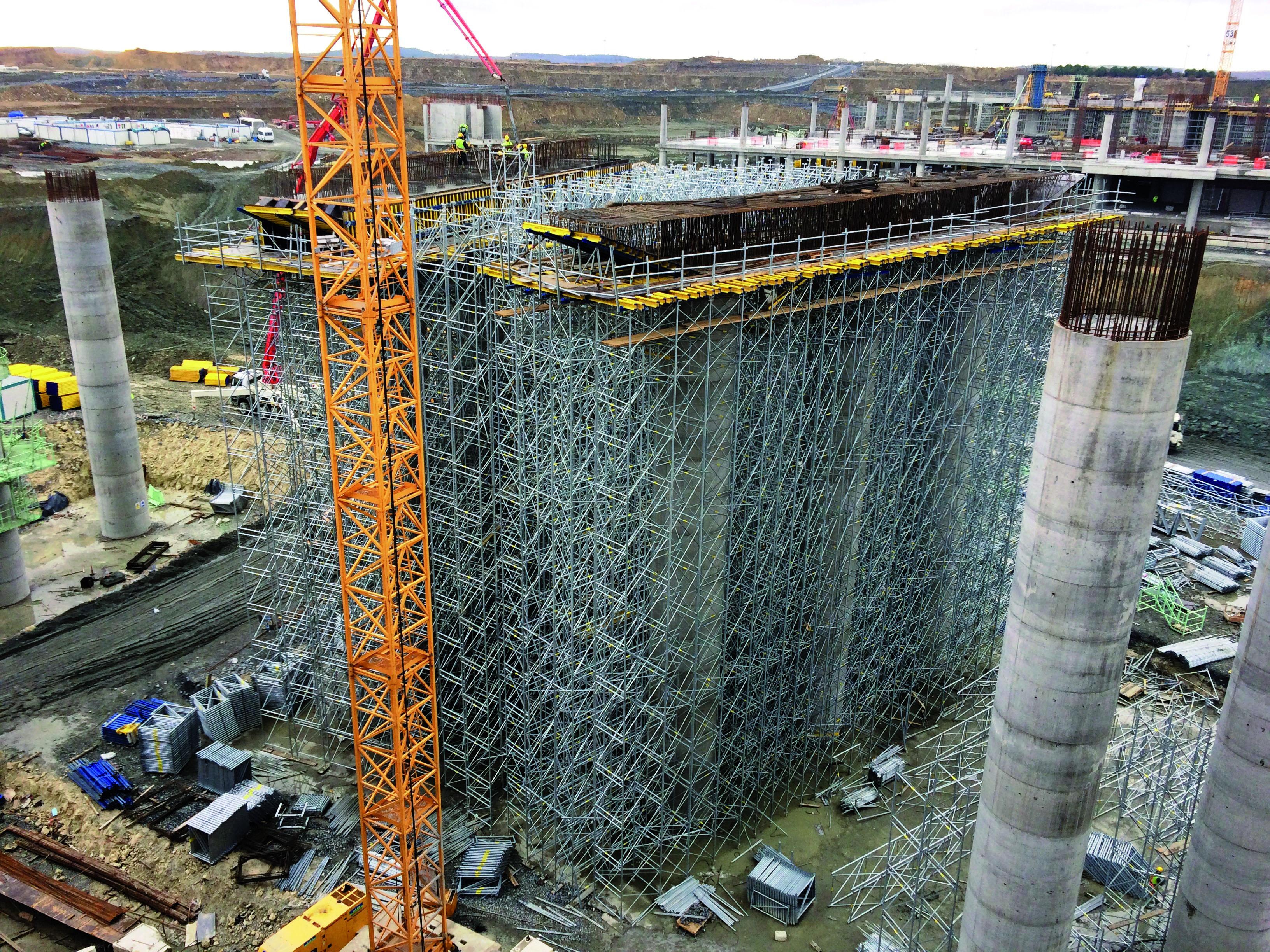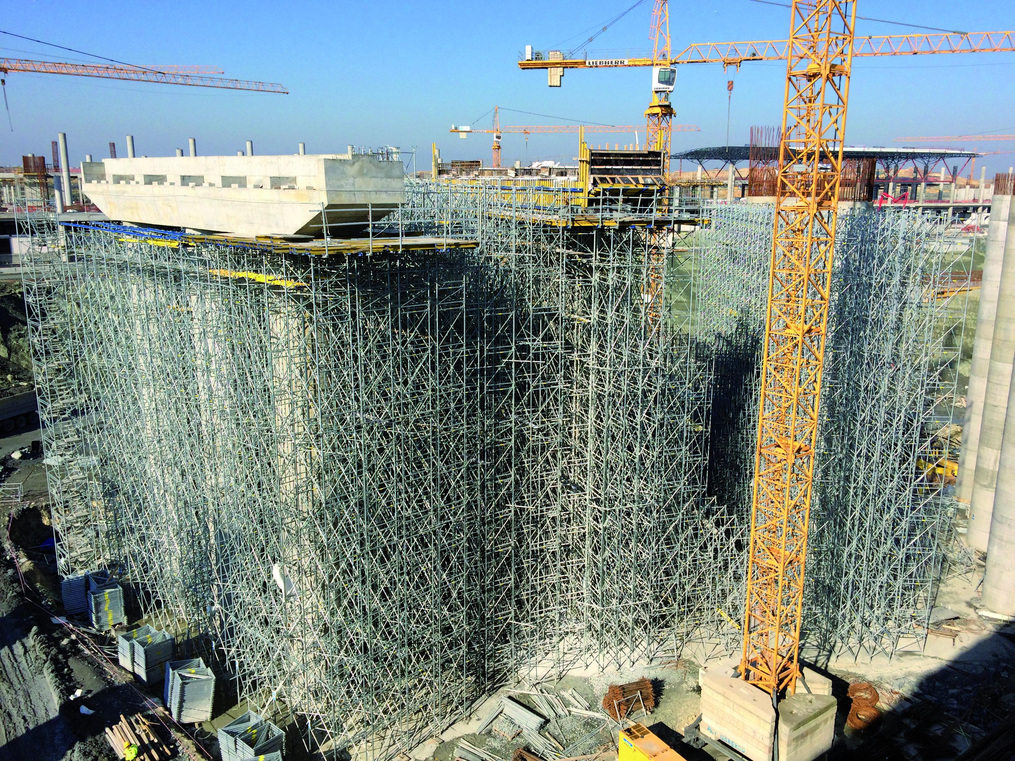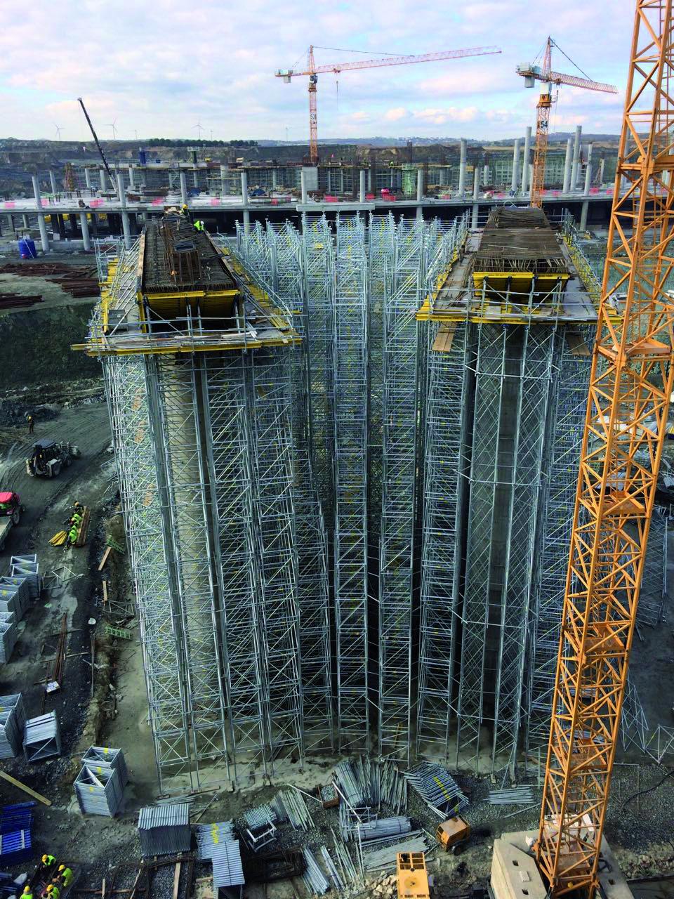 Опорні риштування Doka здатні надійно нести високі навантаження на великій висоті. Ці властивості було використано для підпирання масивних балок на висоті 12 м, на які вкладаються збірні елементи перекриття. Окрім надійності та безпеки, ця система сприяла прискоренню усього процесу, оскільки опорні башти дуже швидко та зручно нарощуються у вертикальному напрямку. Загалом було використано 30 тис. рам опорних риштувань та 100 тис. пог. м дерев’яних балок Doka. Такою ж значною, як і ці цифри, була економія опалубного матеріалу – опорні риштування було спроектовано із максимальною оптимізацією кількості рам.