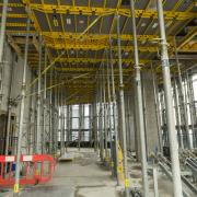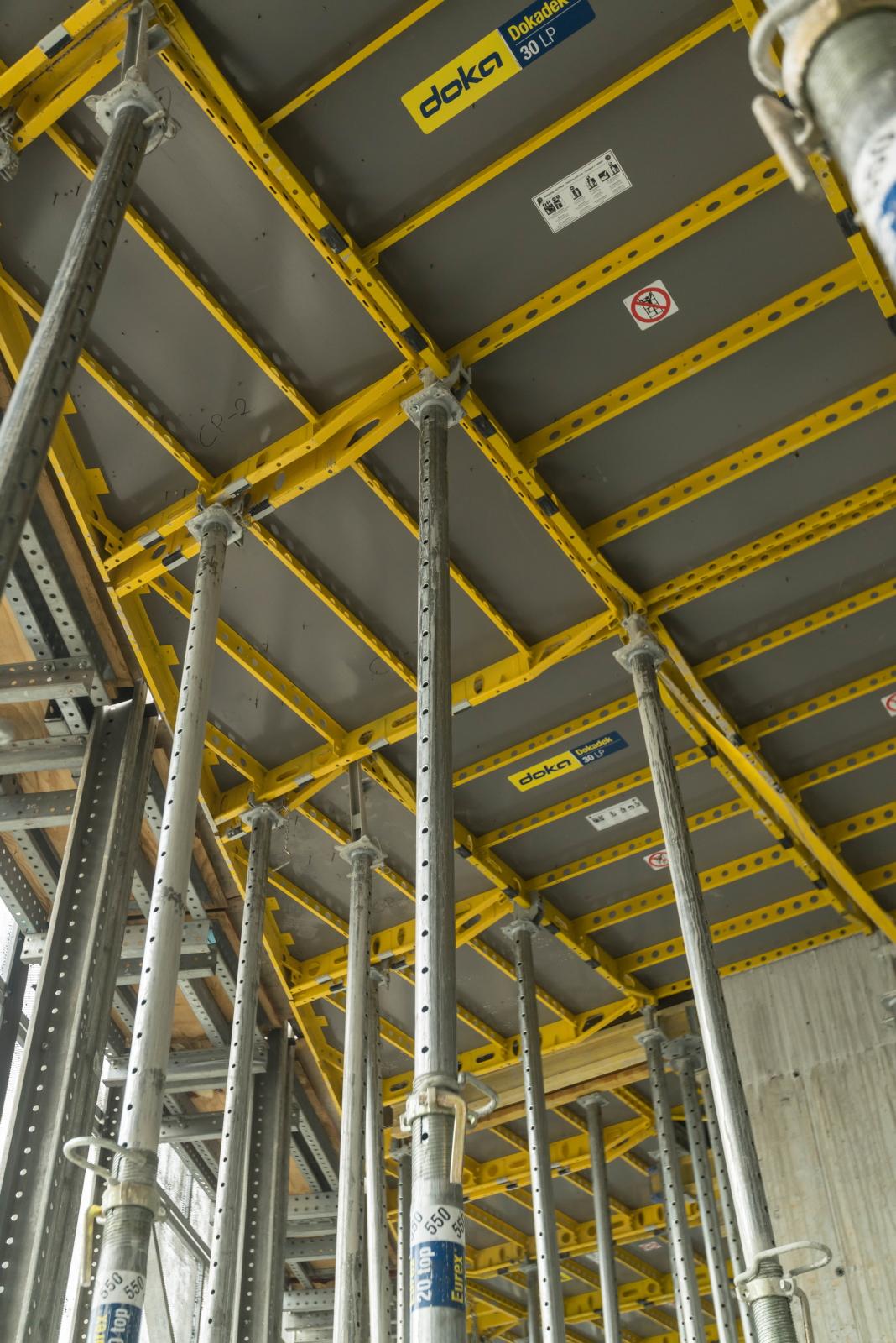 Для бетонування плит перекриття на усіх типових ділянках застосовано 700 м² щитової опалубки Dokadek 30. Підрядник мав досвід роботи із системою у попередніх проектах та відчув її переваги. 3 м² опалубки встановлюються у проектне положення вручну кількома рухами, монтаж да демонтаж виконуються з рівня існуючого (жорсткого) перекриття. Завдяки формі голівок та опорних частин щитів, опалубка надійно зафіксована, що є суттєвою перевагою з точки зору безпеки, особливо зважаючи на вітрові навантаження під час висотних робіт.