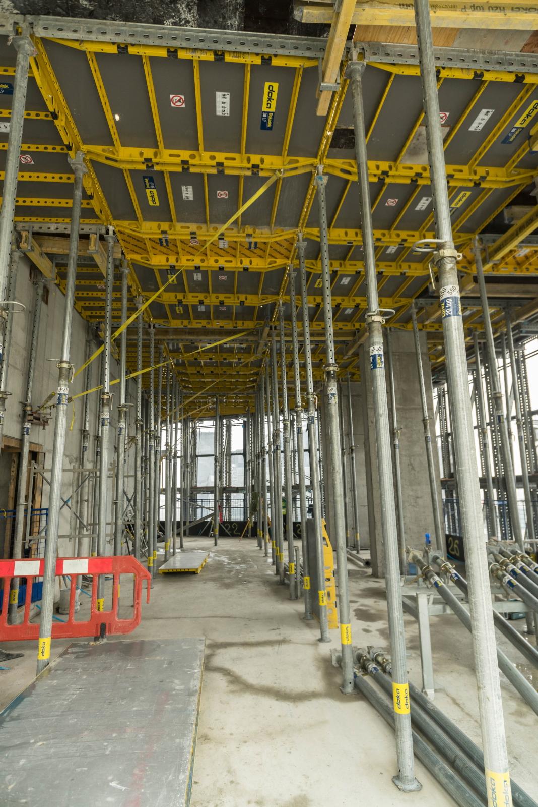 У якості опалубки вертикальних бетонних конструкцій, яка була скомбінована із платформою SCP, застосовано надійну рамну щитову систему Framax Xlife. 500 м² опалубних щитів відповідали за якість та безпеку виконання. Це комбінація забезпечила вільний доступ до конструкцій та, у той же час, була надійно закріплена до ядра будівлі.