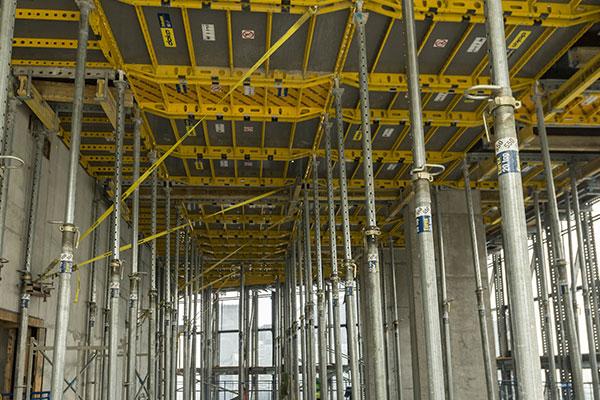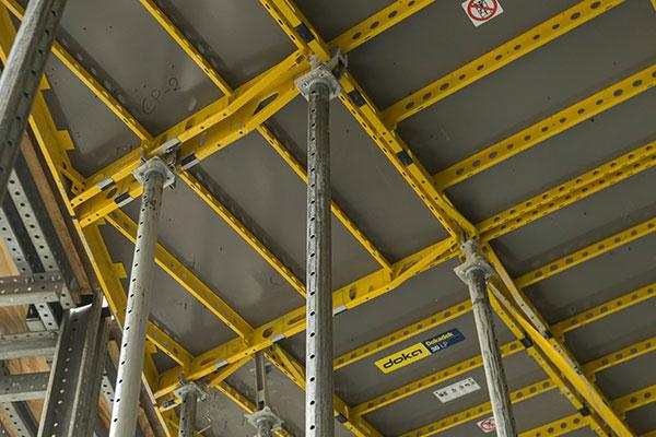 Dokadek 30 not only provides up to 3 m² of handset slab formwork in one panel, but also allows for easy-to-follow installation processes from the floor level below and simplifies site logistics due to the few number of components required. High wind loads on site also meant a slab formwork system that would withstand conditions was compulsory – a challenge easily met by Dokadek, with prop heads having a built-in anti-lift guard to prevent panels lifting.