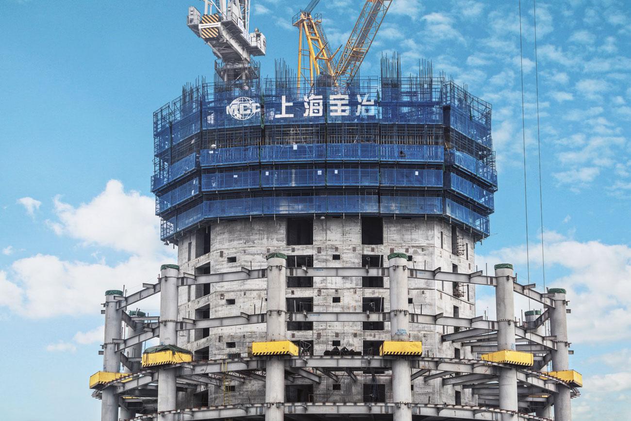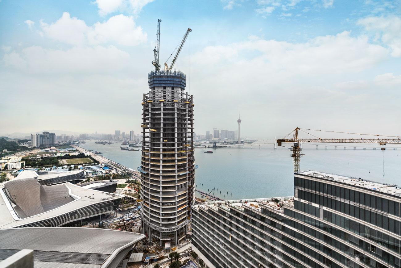 The business complex is a platform for cooperation between Guagdong, Hong Kong and Macau. With the Automatic climbing formwork SKE100 and SKE50 as well as the Wall formwork Top 50, Doka delivers a highperforming and efficient formwork solution. Due to the frequency of precipitation and typhoons, perforated plates were used to fully enclose the working platforms. Corrugated steel sheet was used as weatherproof platform decking.