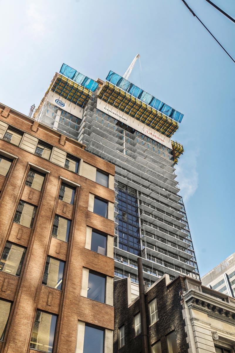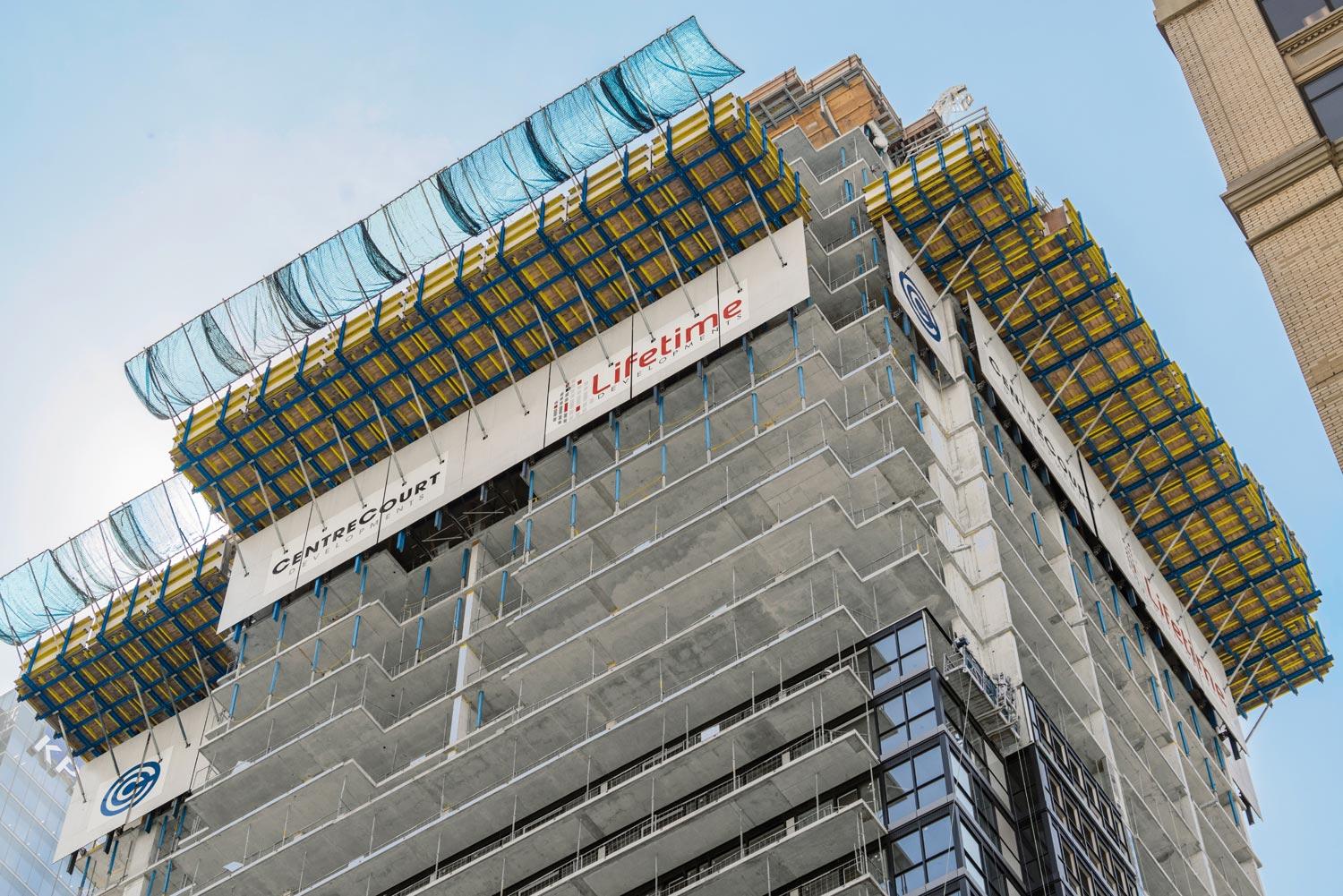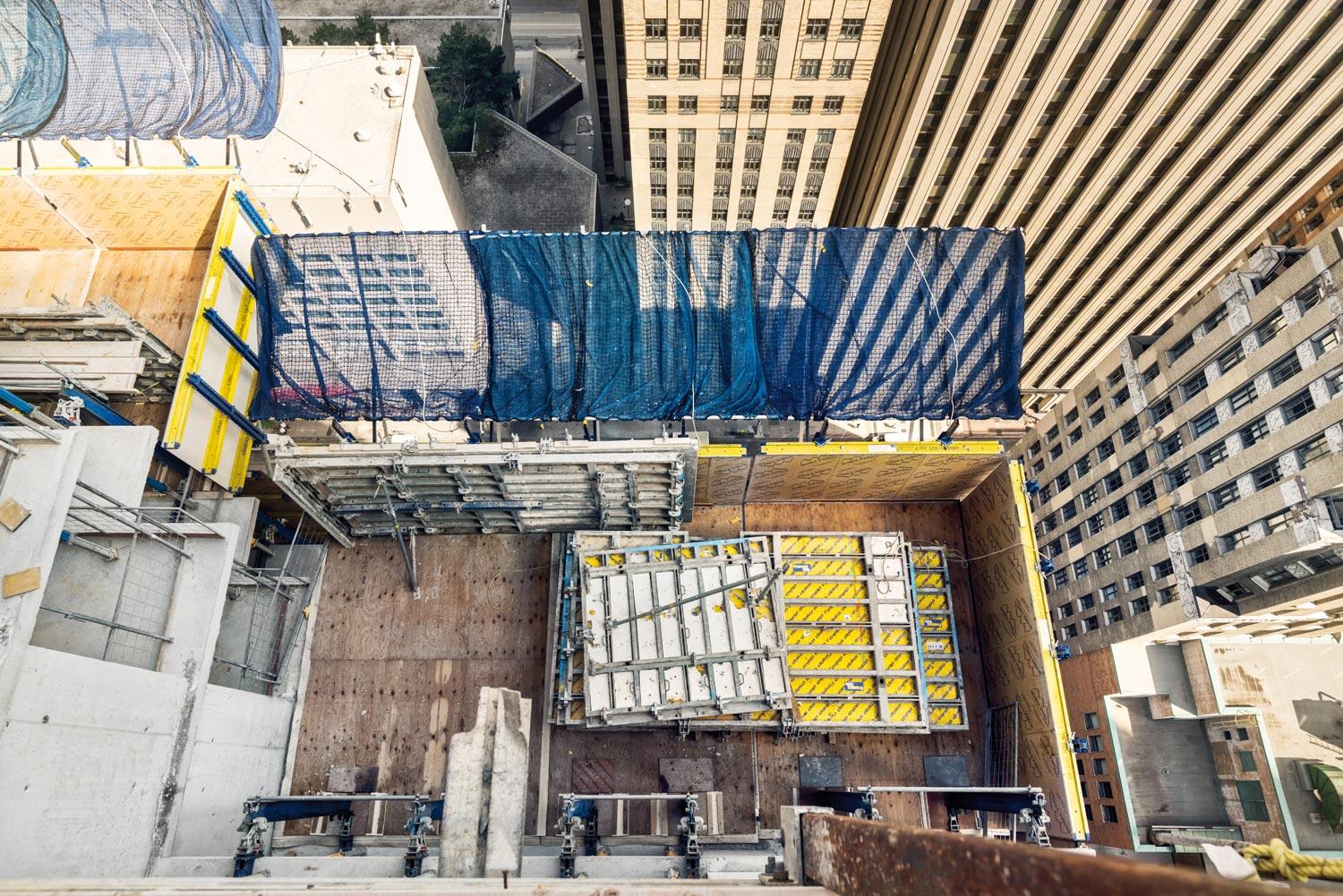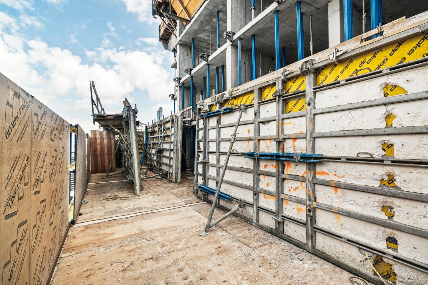 On the INDX condominium project in Toronto, Doka in partnership with Hardwall Construction developed a new hydraulic protection screen system to climb 7 platforms for the next casting step at once in one hour with no crane. The system incorporates a 16 ft loading platform to