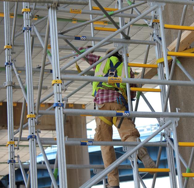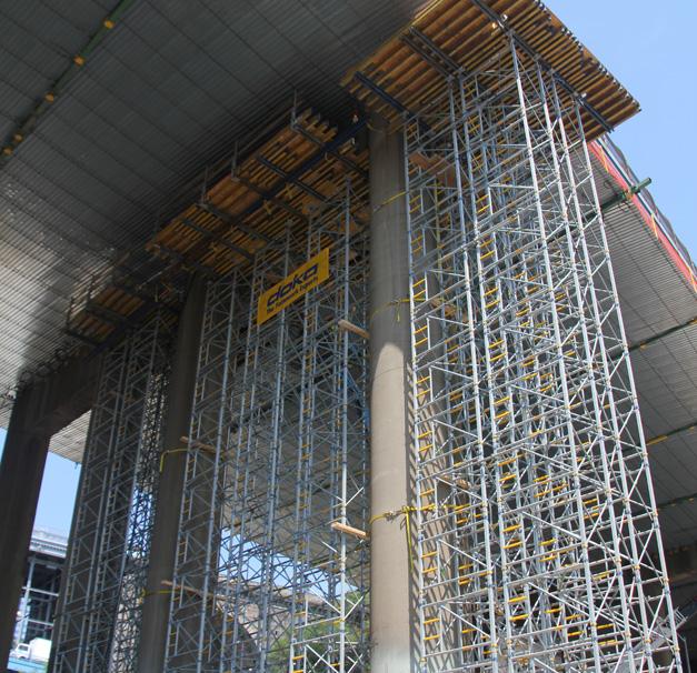 A total of eight pier caps were replaced or restored on the bridge. They were formed from the ground up with Staxo 100, ranging from 20 feet to 90 feet in supporting height, 100 feet to 125 feet in pier cap length, and 7.5 feet to 12.5 feet of concrete depth. On the top of the Staxo 100, Doka designed custom preassembled tables to form the soffit for the pier caps. The other five pier caps were incorporate Staxo 100 towers with a custom suspended deck solution, because of the extreme height. The suspended deck was supported from a steel jacking system, which relieved the load of the roadway from the columns. From this deck, smaller Staxo 100 towers were fixed to support a form system similar to the previous three caps.